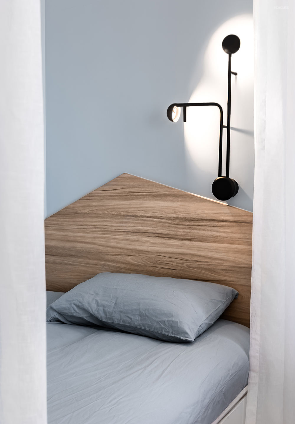 特制的床头其实就在门的旁边,不撩开帘子的话还真是看不到呢。整块实木床头板是一个不规则的三角,附近搭配了一盏线型双头壁灯,休闲随意。