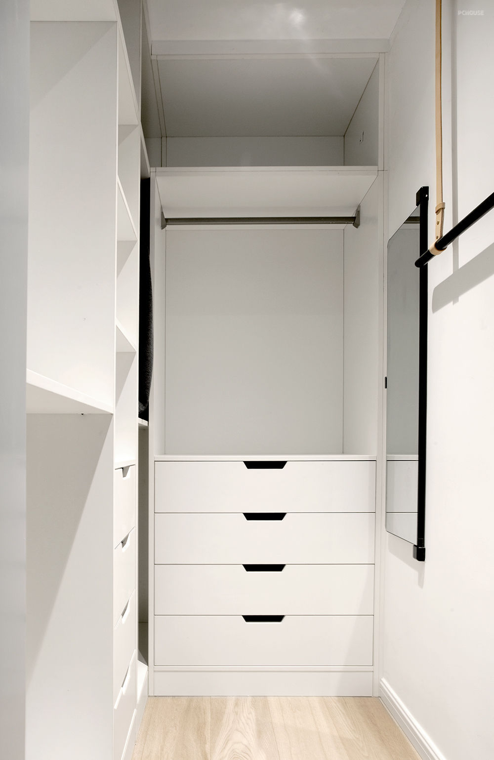 占地2.5㎡的衣帽间,为卧室扩充了更多收纳可能。根据Rebea的需求,在内部做了功能分类的细化设计。除了L型储物柜的部分,还在右边加了一个可以挂放熨干衣服的晾衣杆,和一面可以转动的镜子。