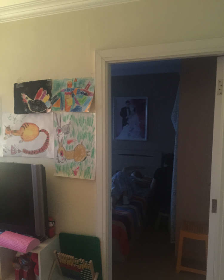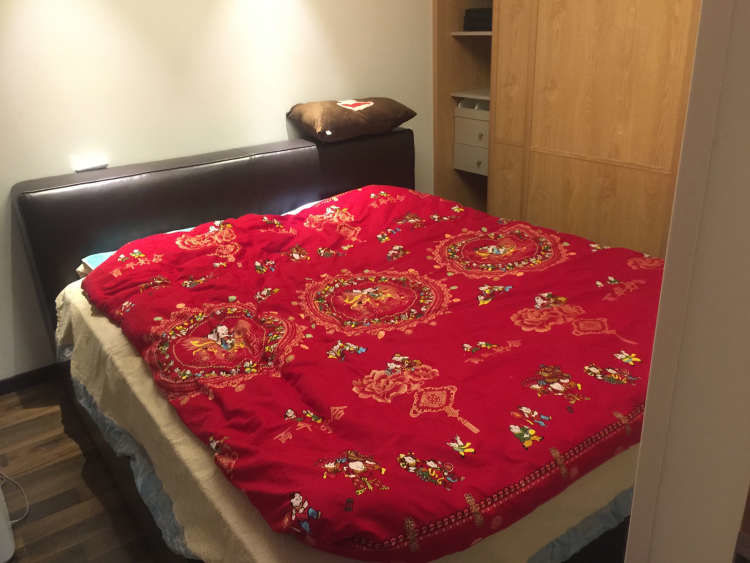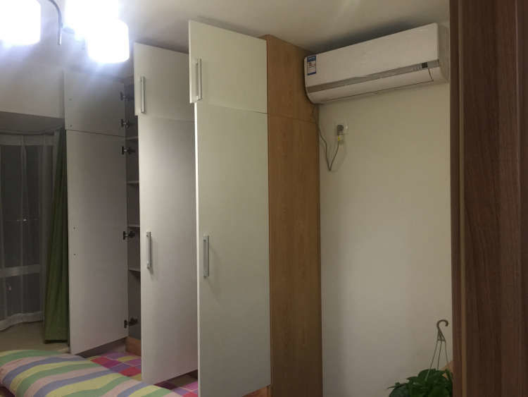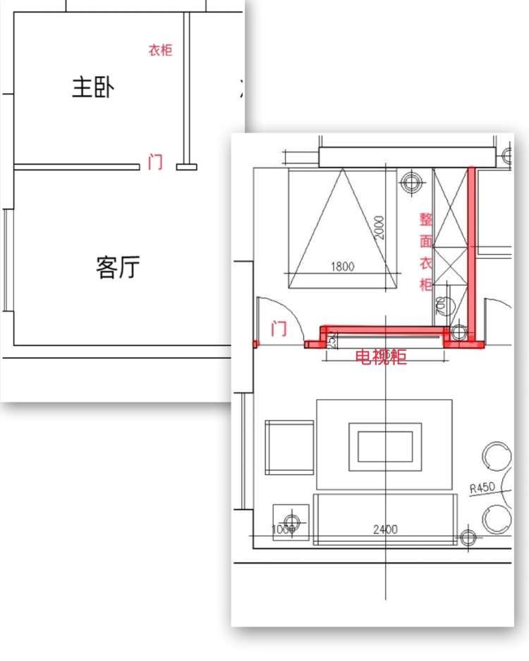 第二个问题,主卧室的门要移动到最里面,这样经过客厅也不会看见主卧室里面,也不用天天关着门。另外原来门的位置封闭后将衣柜做满整面墙,有效的增加了储物量。另外客厅的面积较小,电视墙往主卧室里推进一部分,这样电视柜便可内嵌在里面,客厅因为没有突出的电视柜而感觉扩大不少。
