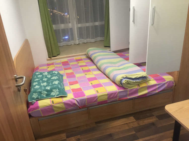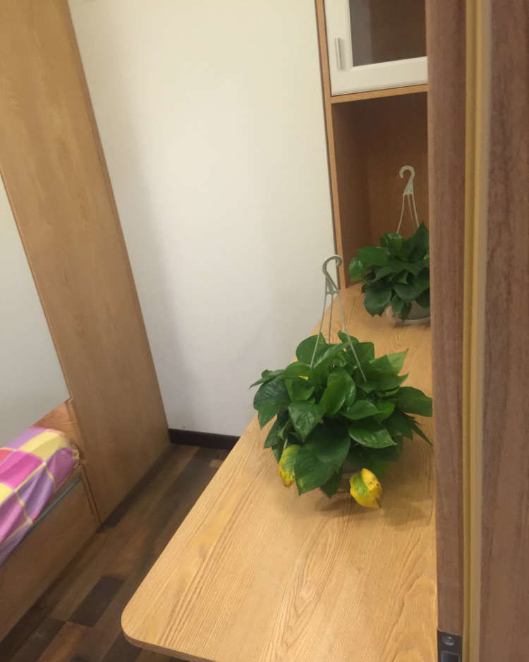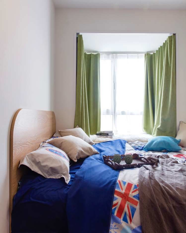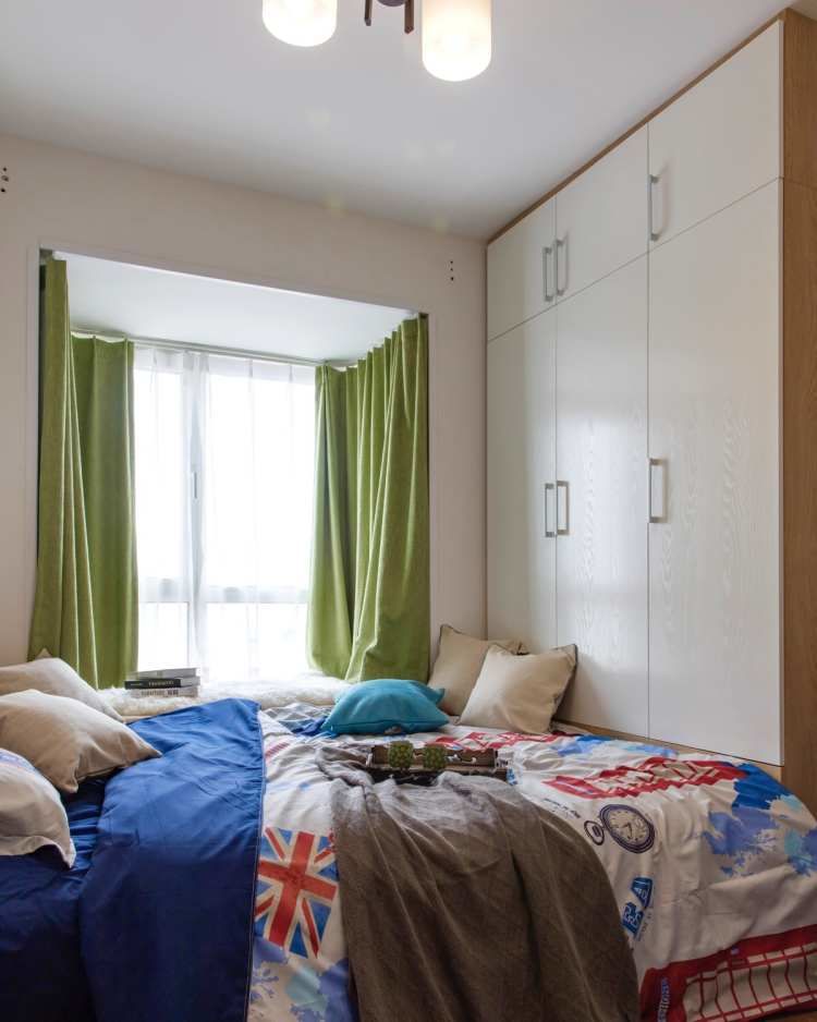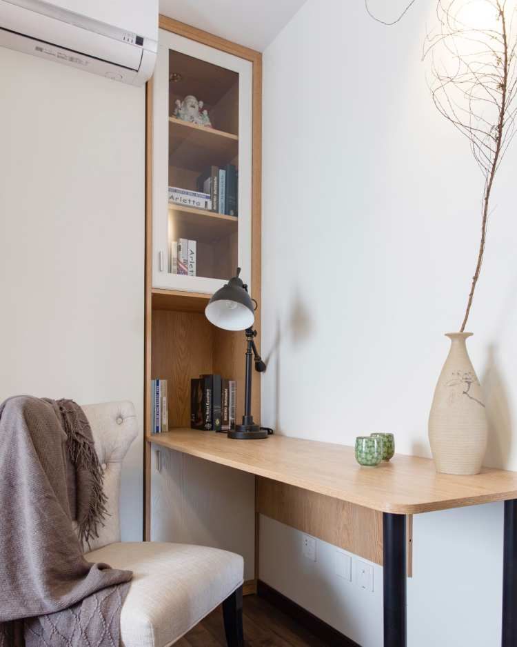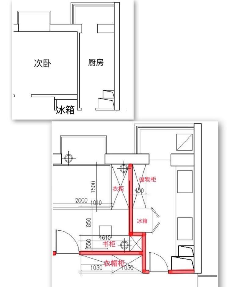 第一个问题,通过改动小卧室和厨房之间的墙来解决,弓字型墙体设计很好的互补了空间的不足,厨房这边利用突出去的部分可以放下大双开门冰箱和一个高的储物柜,而小卧室那边凹进去的部分便成为了书柜。原来放冰箱的地方就可以拿来放进门用的衣帽柜。这么看感觉是占用了小卧室的面积,但是对于这个卧室来说正常功能并没有收到影响,现在的布局可以放下1米5的双人床,有大衣柜,也能兼顾书房。但是对于厨房来讲,功能可是有大幅提升,解决了大冰箱也增加了储物量,对于一个做饭频繁的家庭来说绝对更有实用性。