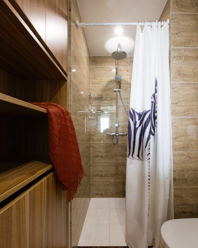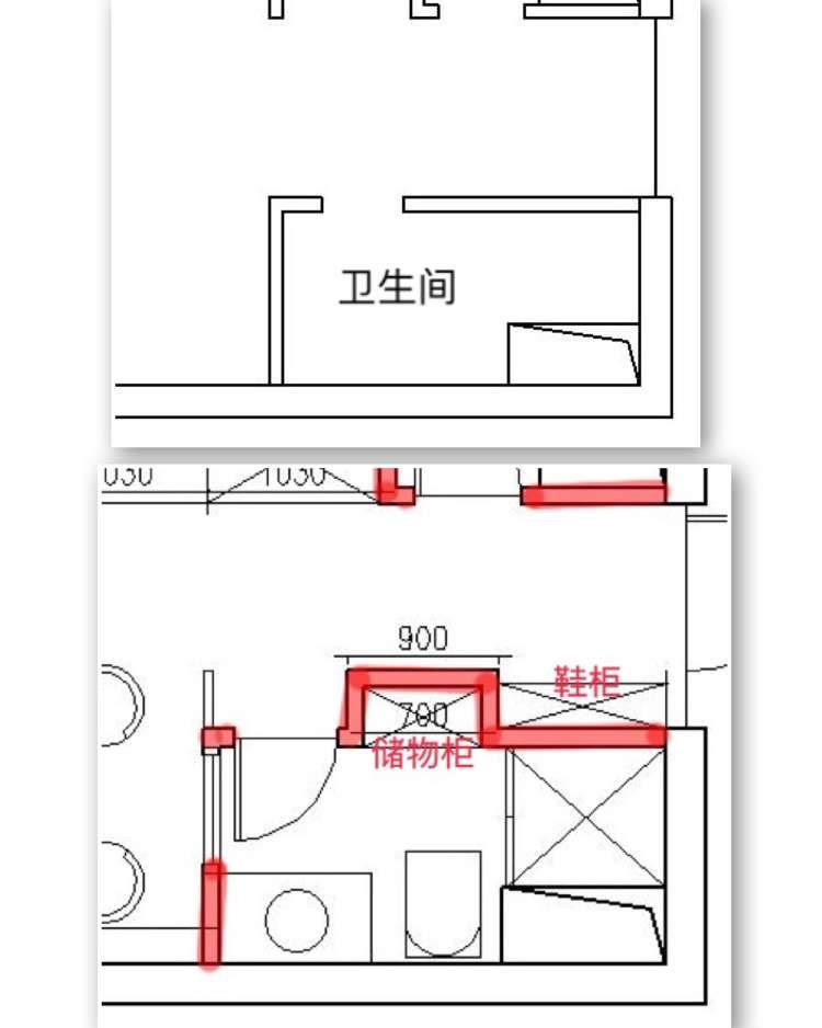 第三个问题,也是利用墙面弓字型的改造方法。卫生间里面利用突出去的部分可以做成储物柜,收纳卫浴用品,外面则刚好把鞋柜嵌在里面,利用了这面墙的互补关系。