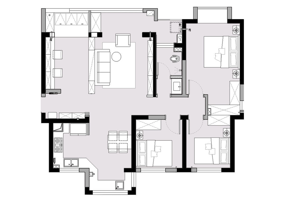 解决方案:1、入口左边的空间作为开放式书房,靠近阳台的墙体拆除,把书房延伸出去,同时增加榻榻米及书柜的功能,为了让家人有更多的互动及采光的考虑,我们在沙发背靠的柜子做了一个镂空的设计,相当于一个大的窗户,这样让整个空间更加开阔,客厅和书房也可以交流互动。 2、把北面的阳台墙体拆除,把厨房的操作台面延伸出来,中西厨分开,满足女主人烘培的需求如果每个房子都有这么大的一个厨房,我想