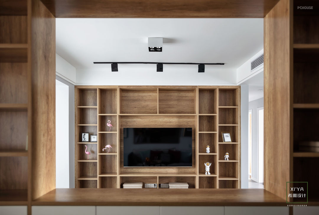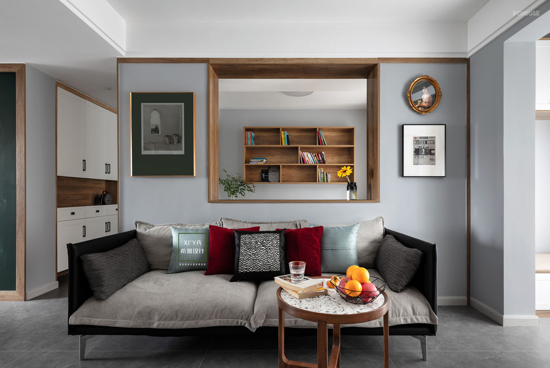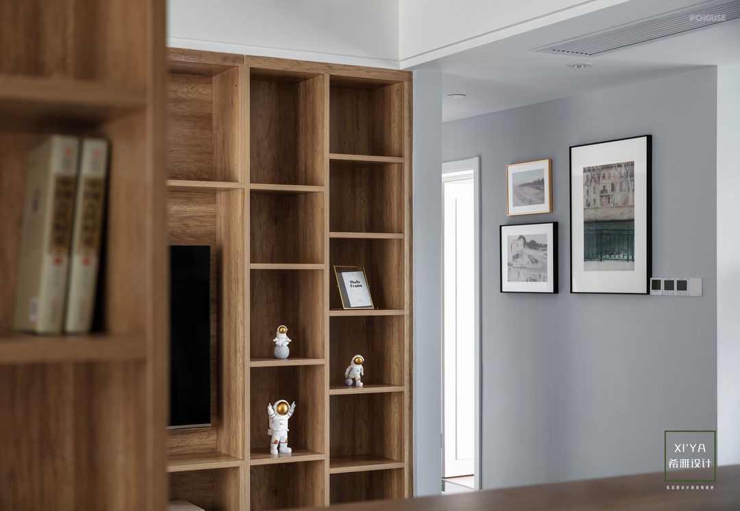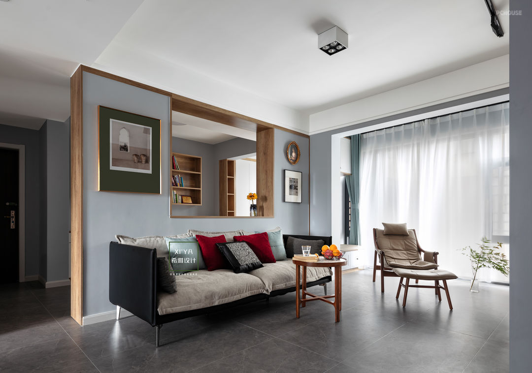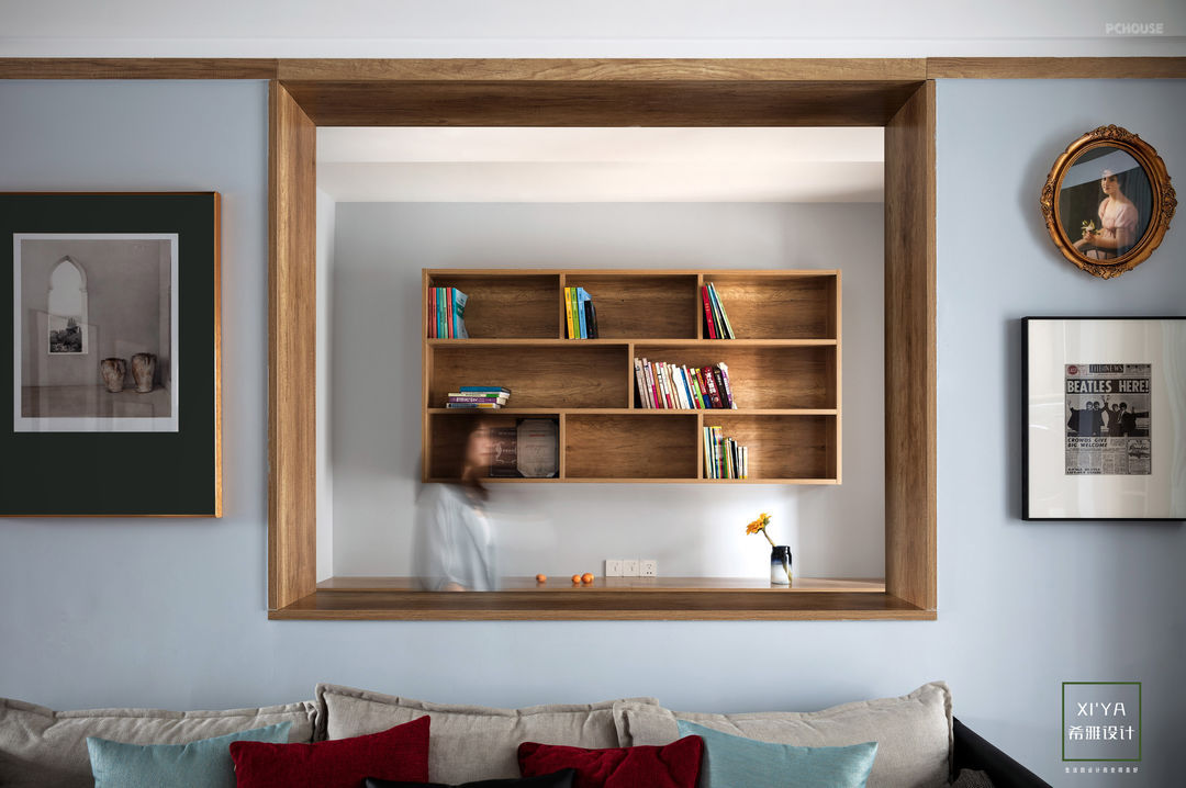 “窗洞”设计更是客厅、书房家人互动的窗口,整个空间不管在哪个角落,都有物品的的归属地。