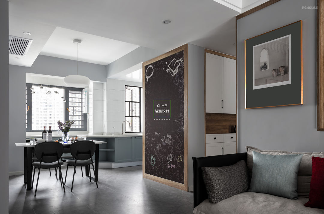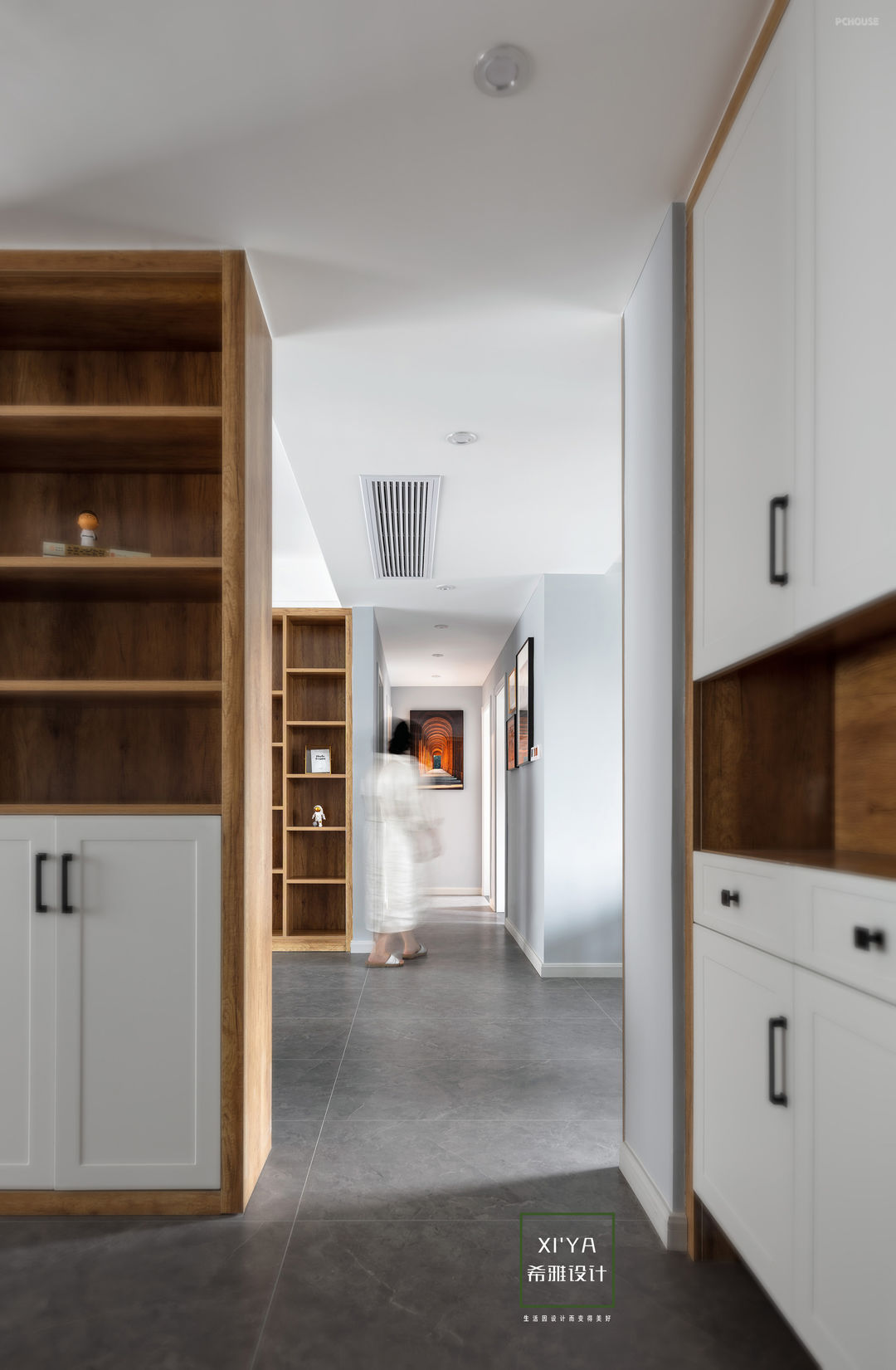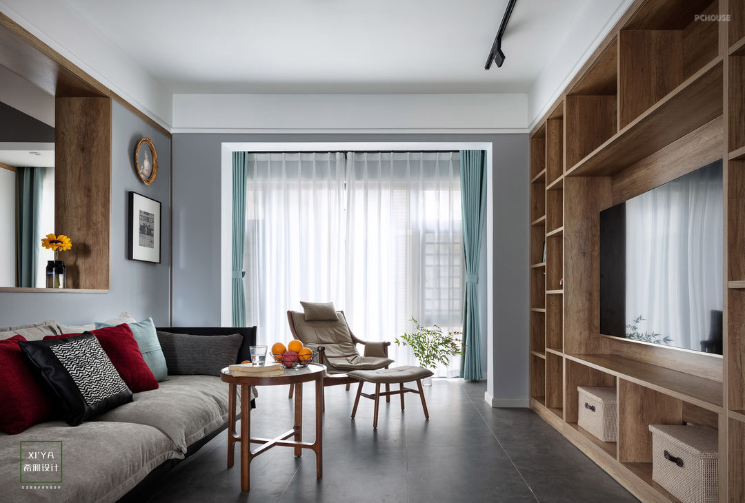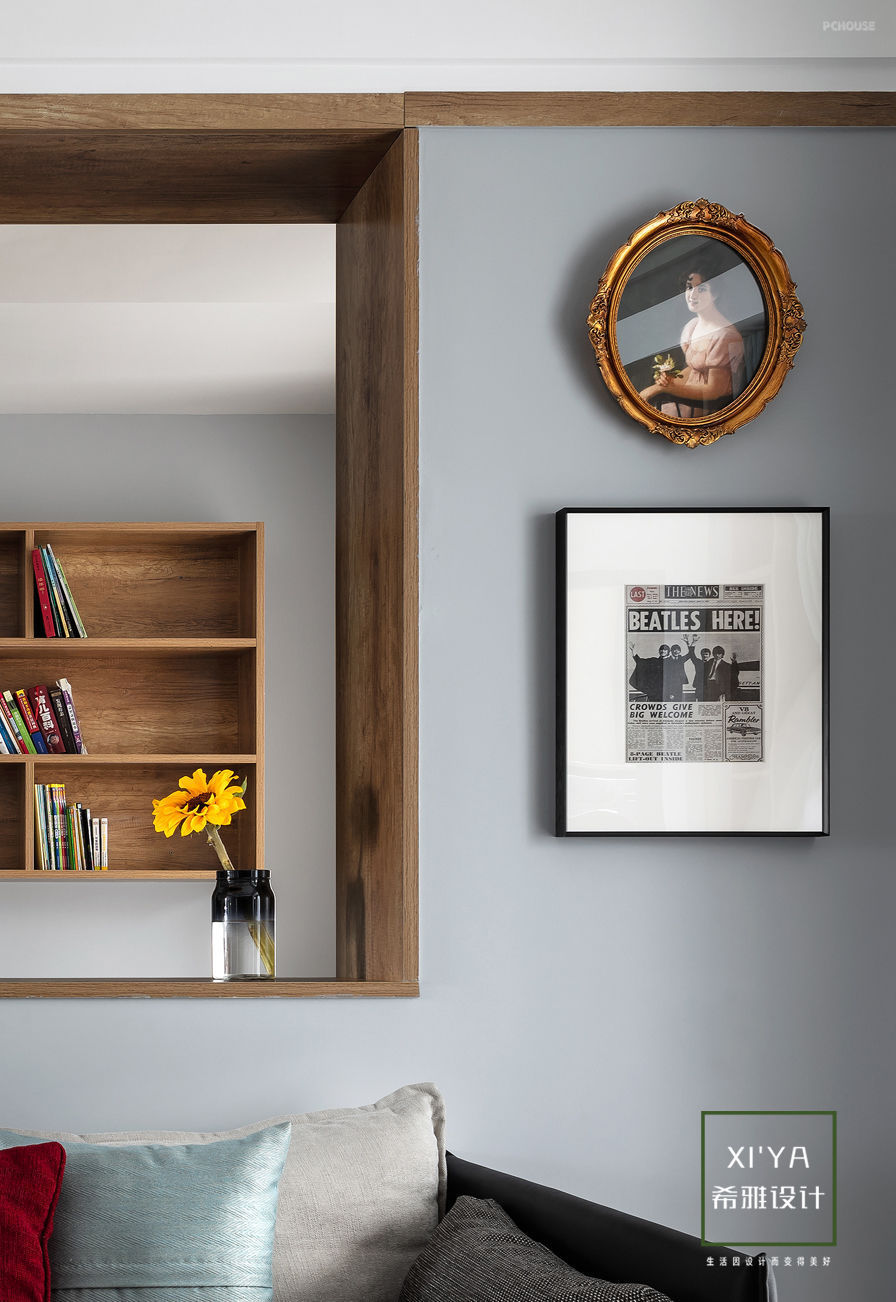 “窗洞”设计更是客厅、书房家人互动的窗口,整个空间不管在哪个角落,都有物品的的归属地。