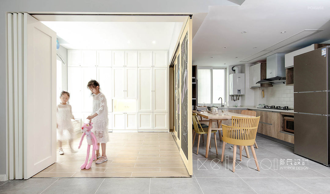 自由开合的儿童房,配上不同形式的门型隔断,也让厨房的功能更加灵活宽敞,在“精神奕奕”的傍晚时分,作为作业台的餐桌,更可以借用房间空间,让整个空间瞬间大了起来。