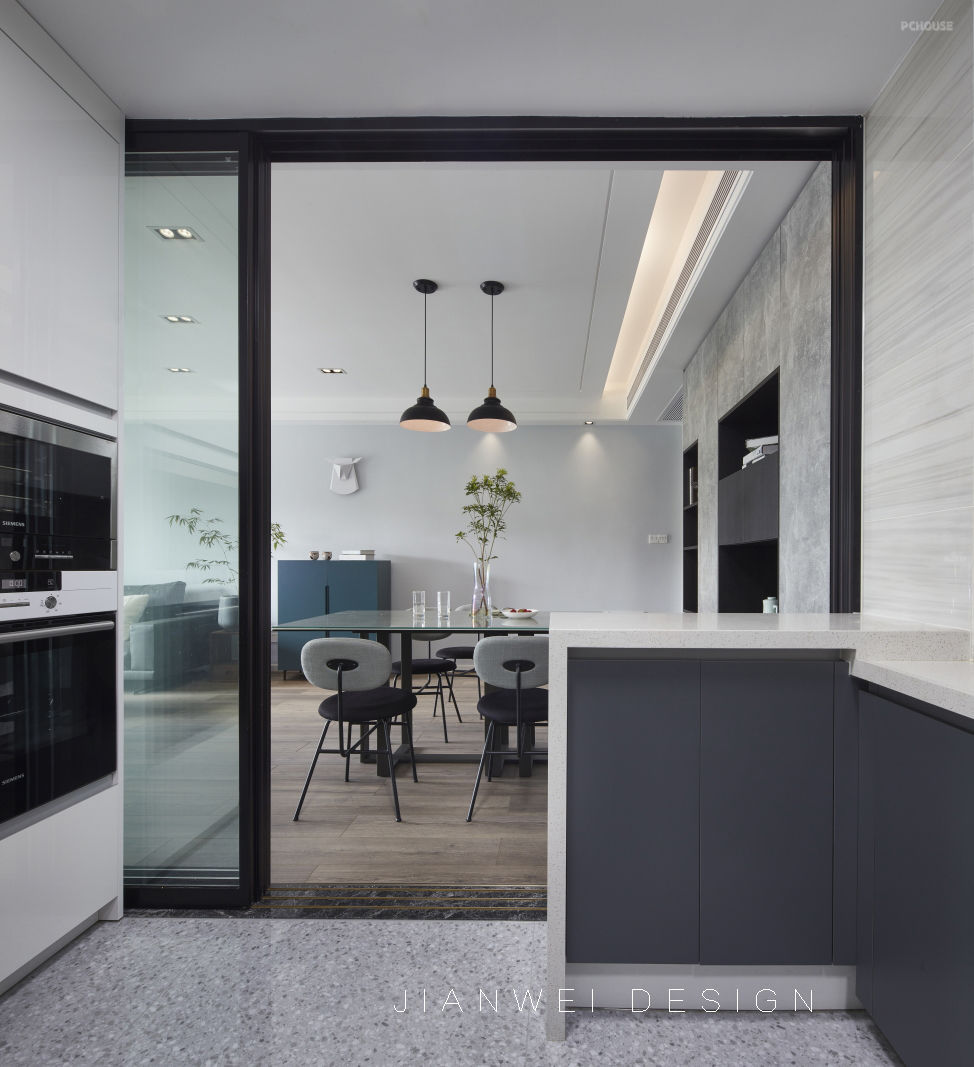 在厨房与餐厅中间位置设计一个造型时尚的吧台,家庭聚餐或者朋友聚会,厨房通过吧台与餐厅互动交流,增加厨房内与外界的互动性,让做饭也变得更加有趣。