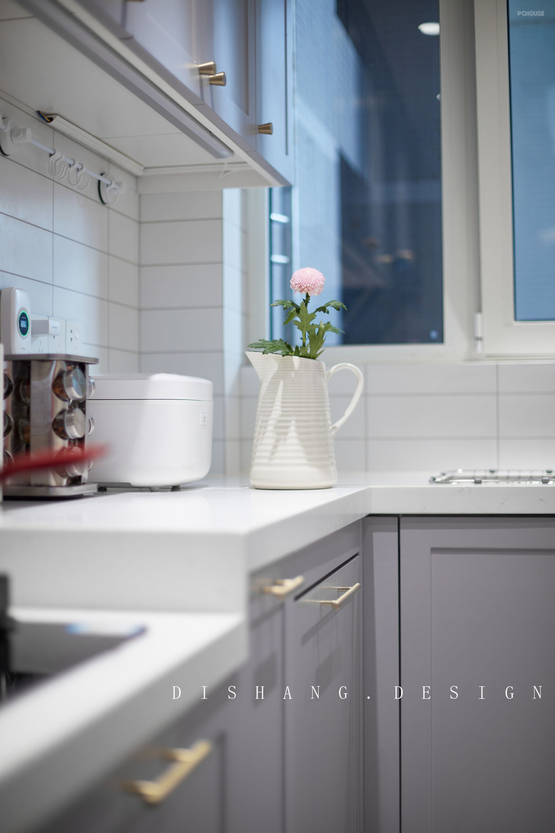 U型厨房增加台面操作面积,基本功能齐全,划分明确,操作动线更加合理流畅;灰紫色与白色搭配,加上金属把手的设计,空间温柔而高级。