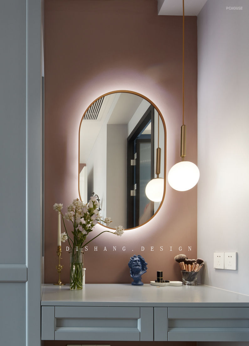 卧室墙面以脏粉色为底色,用白色和金色来描绘居家的形状,再以饱和度高的蓝色调和空间氛围,营造一个温柔、安宁、高级的休憩空间;在软装搭配上更加倾向细腻和温馨,原木双人床、舒适的床上用品、绒面窗帘、对称的复古床头壁灯散发出独特柔软的气质,空间达到平衡。