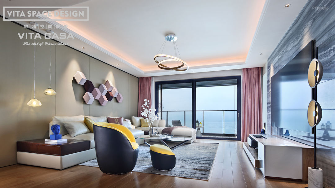 客厅的色彩和质感是整个空间的美好衍生,暖色为基调,不同深浅的粉色,柠檬黄休闲椅提亮了空间,心情也随之明朗起来。大尺度的双推玻璃门,一望无际的海,和煦的阳光与清新沁人的海风迎面而来,带来雅致而宁静的奢享体验。