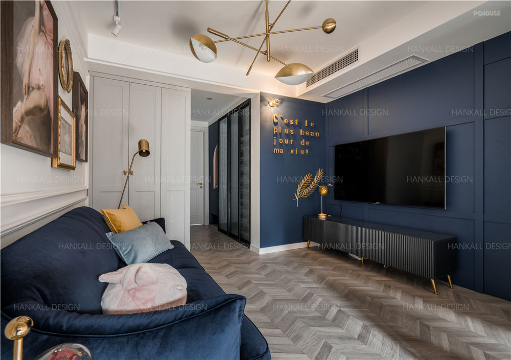 客厅的主色调为今年的流行色“经典蓝”,是不是很有前瞻性 由于电视机背景后面就是卫生间,所以为了弱化卫生间的存在感,设计师选用了简约的大块拼接木质面护墙板作为背景,将卫生间做成隐形门,完全与电视背景融合在一起,也让整个空间变得更加完整。