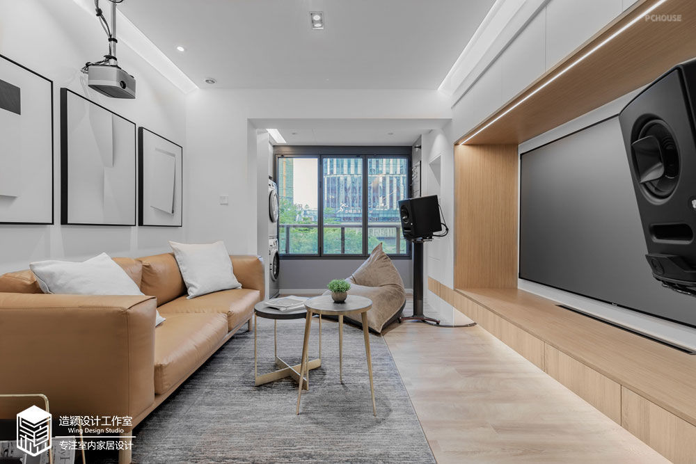 簡潔明朗的空間,淺色的木紋與白色墻漆搭配增加了空間的質感。超高清投影、HIFI音響設備,為業主提供了很好的觀影感受,晚上一家人坐在客廳看大片,溫馨感爆棚。