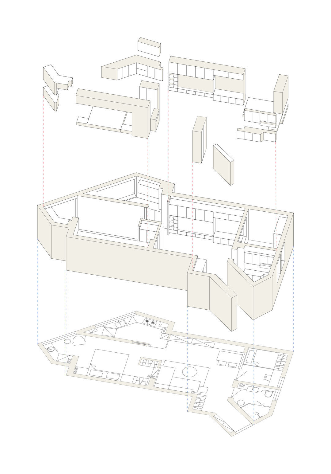 屋主找到我们的时候,是去年的9月份,她说很多人都在讲她为何要买如此“难搞”的户型,勘测时发现因为是公寓楼,开放商需要考虑到每个户型都能靠天井采光,导致室内结构靠外立面的空间都是异形的。就算是这样,也无法避免客厅和小房间的采光是极差的。