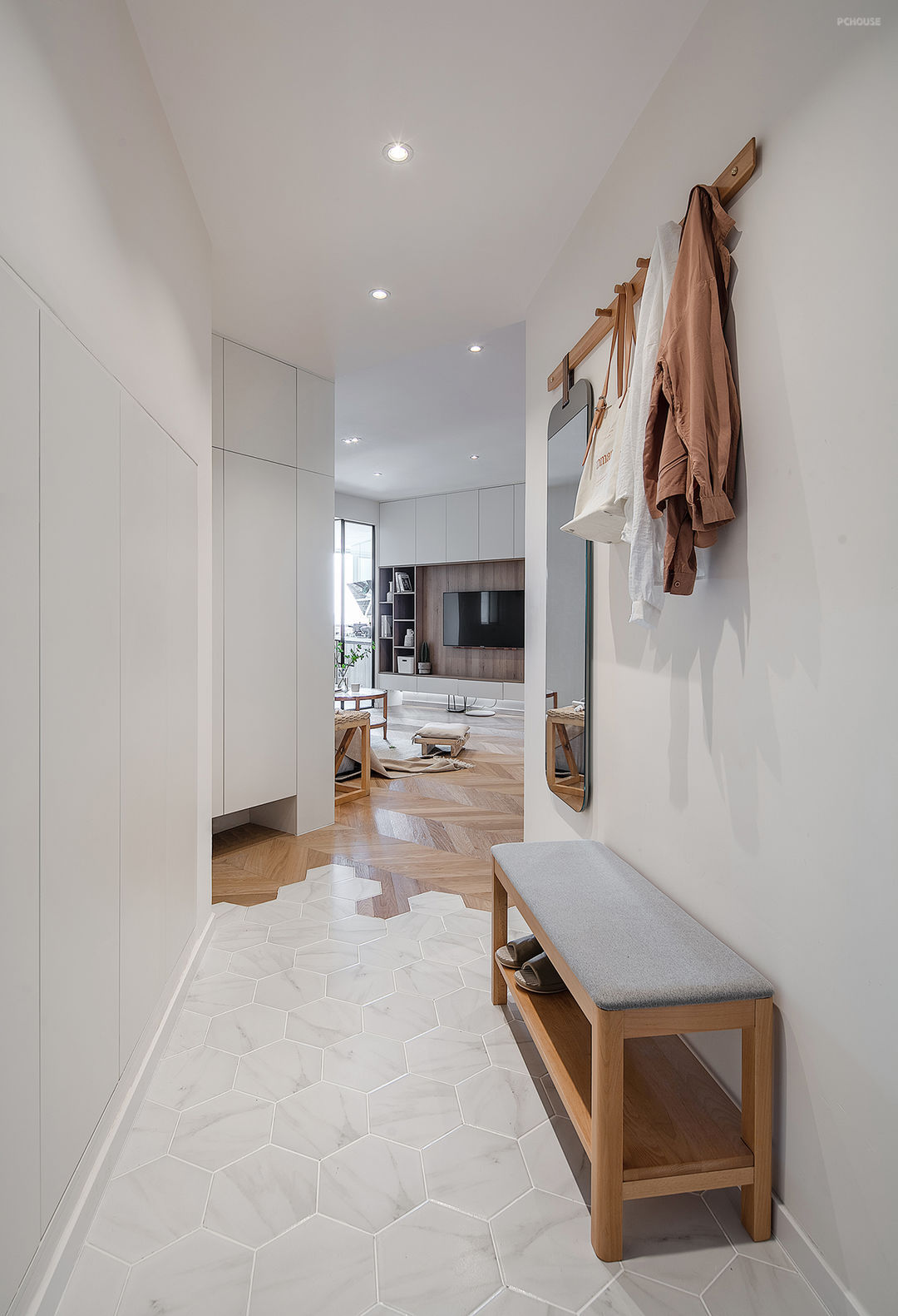 入户的左手边平面图上可以看到,我们是将墙体掏一半(经过物业准许)加上门垛做了一个22公分深度的斜插薄柜,拍摄的时候数了一下能放置业主40多双鞋子。右手边一开始业主要放斗柜的,后来搬家后鞋子够放了,就按照我们的软装清单里买了这款换鞋凳和穿衣镜挂衣钩一体,我想这样功能性更强大也更灵活一点呢,业主说,先生每次回家挂完衣服都要欣赏一下自己的“盛世美颜”。嗯,你们开心就好哈。