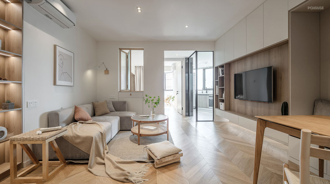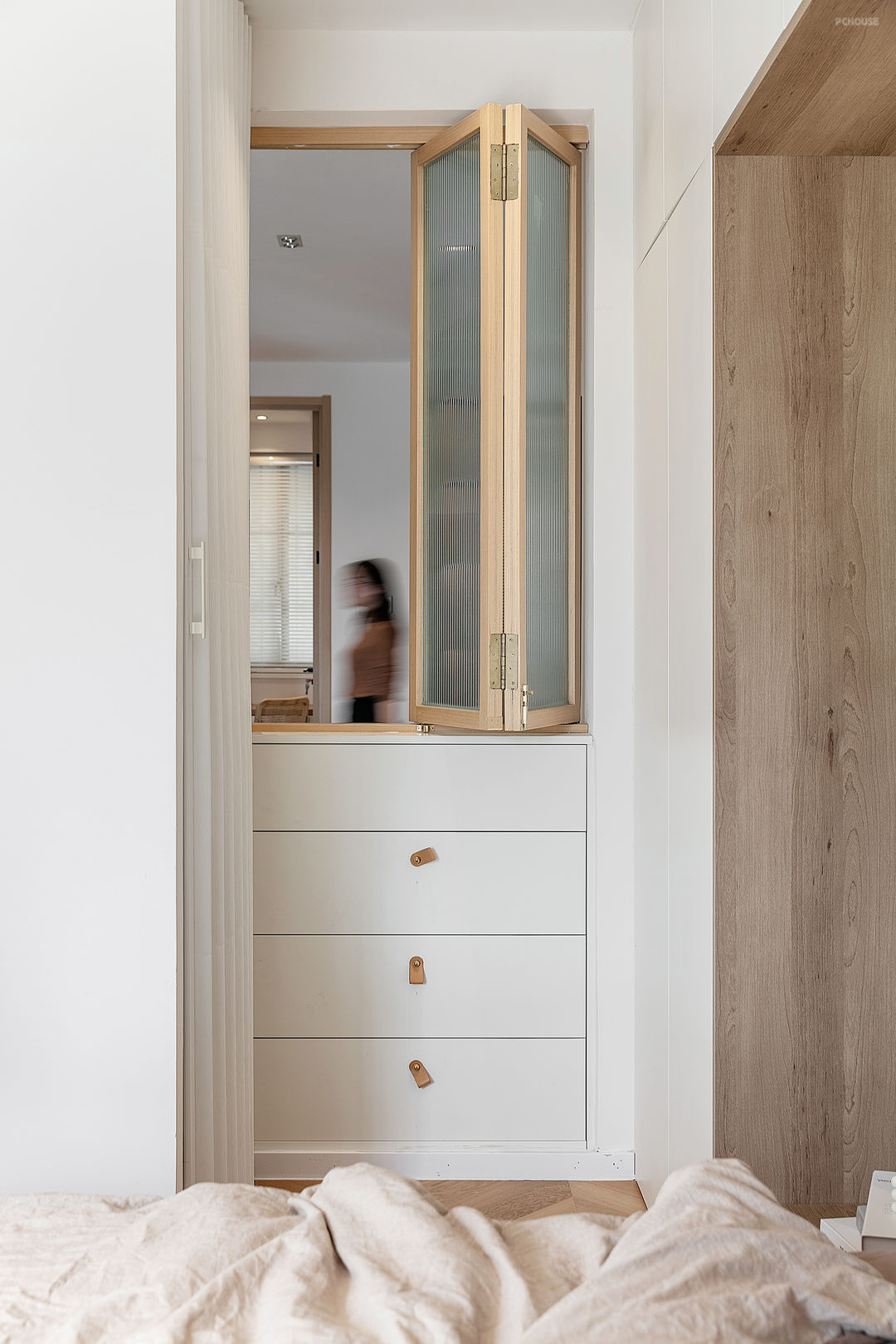 这个角度就能看出来家里改造后的采光啦,我们是把卧室两边各做了一组柜子,(业主说像是个小衣帽间)在中间开了一个室内窗洞,窗洞的尺寸是90公分,窗洞下面也是抽屉收纳,因为是业主和先生两个人居住,基本是没有噪音打扰的,家里来客人的时候可以把折叠窗关上,长虹玻璃透光不透影,折叠窗保持打开的状态客厅的采光和通风性好很多。并且我们改变了主卧进门的位置,将厨房的门做成内嵌的移门和转交的玻璃隔断,将不需要私密性的厨房的采光全部引进到客厅来。客厅再也不是以前那个黑暗和封闭的空间了。