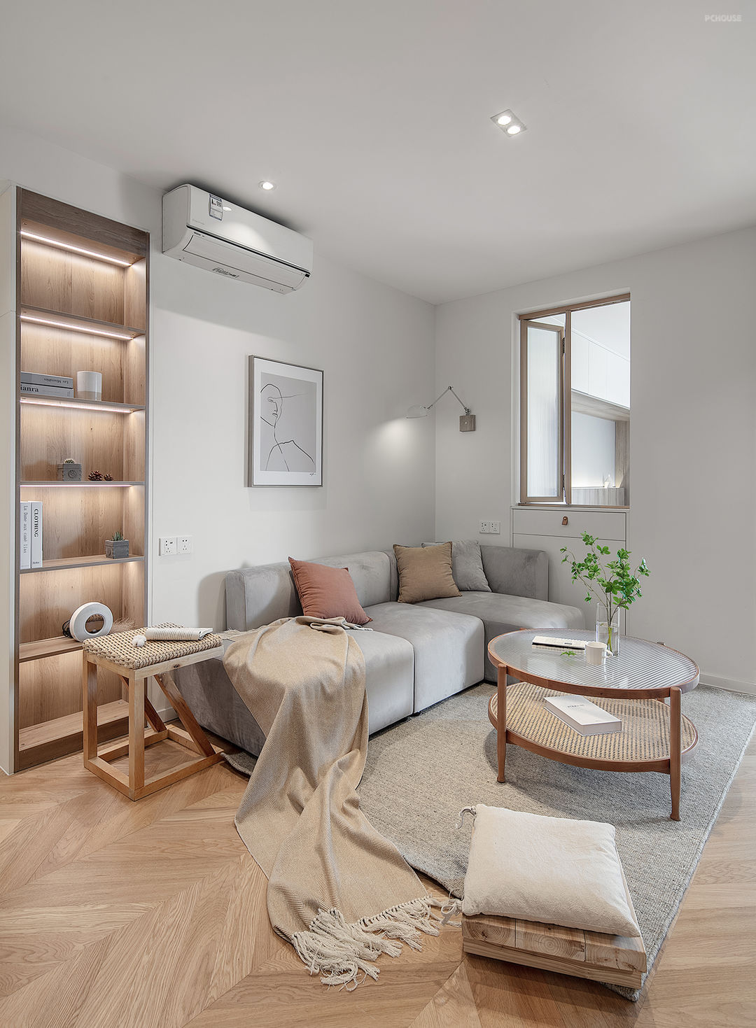 客厅利用拐角的柜子空间嵌入了一组书柜,两位学霸业主的医学类的书都挺大,这会估计摆的满满当当了,整体的色系都是比较低饱和度,茶几在纠结选70公分还是80公分的时候,业主说一个人糊口饭吃的时候喜欢边看电视边吃,那就选了80公分的,找了一个小矮凳的图片,业主舅舅自己利用家里面的一些用不着的木材给做了一个,还挺和谐的。