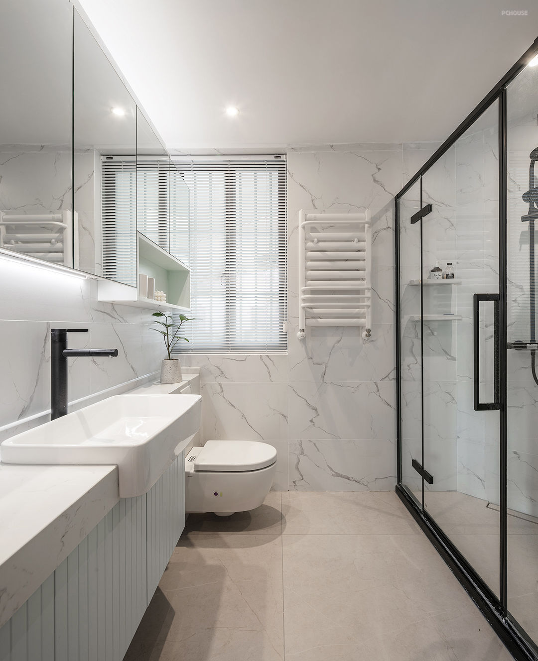 把面盆换了个位置,因为只有40公分的空间就做了一个半嵌入式的台盆,增加台面的空间,矮版的壁挂马桶刚好是可以和台面做一样的高度。镜柜的设计也是考虑到经常要拿取的刷牙杯等,没有将镜柜做满。