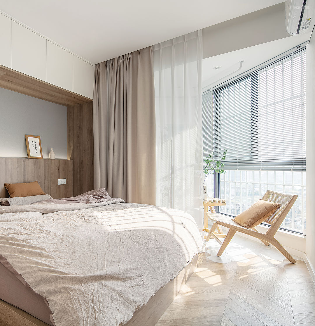 卧室我们也是把和阳台之间那个门拆了,业主理念还是很好,不想把阳台作为晾衣服空间,纱帘后面隐约看到洗衣机烘干机就能代替晾晒的功能啦。休闲阳台搭配休闲椅冬天晒晒太阳,夏天晚上乘乘凉。卧室的收纳也很惊人呐,吊柜放换季的折叠的衣服。