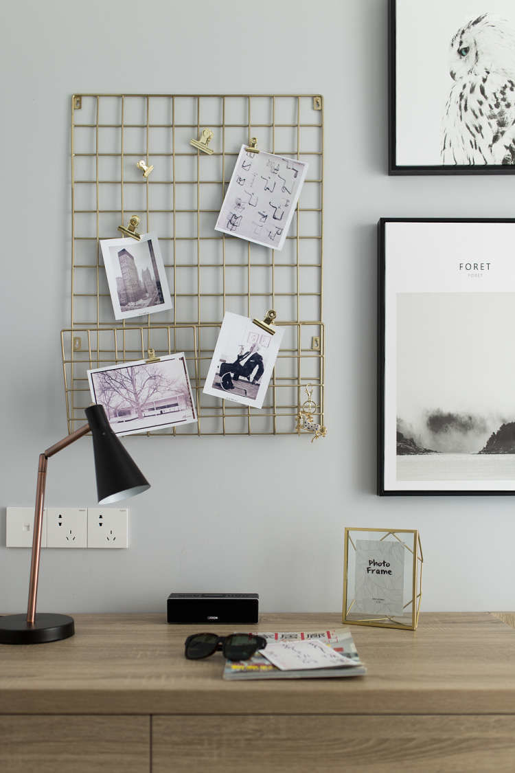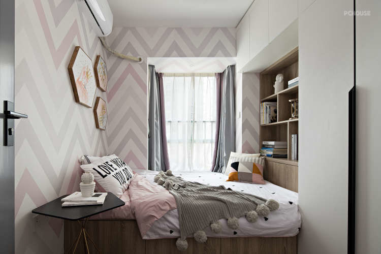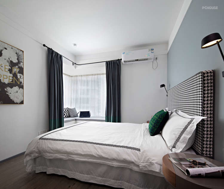 主卧因为空间不大,所以我希望它有适当的时尚感,但不夸张,所以选用了千鸟格的床,搭配纯白的的修边床品,点缀质感的抱枕。配以简约的黑色小壁灯。