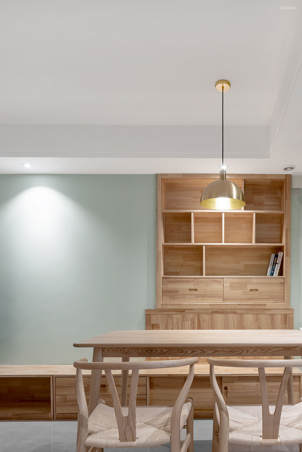 淡绿色和原木色的搭配,这个空间就会变得格外的安静,环境的氛围营造是很重要的,特定的环境相对的应该有特定的氛围,这样使用起来身心才是舒服的。