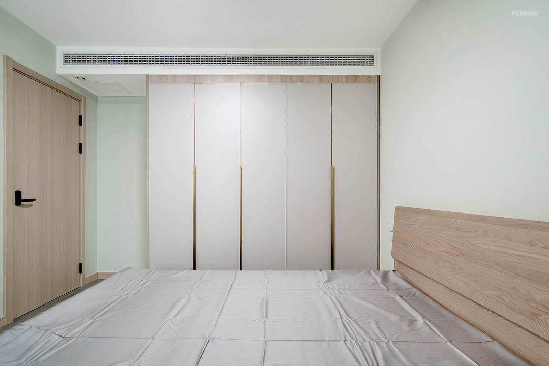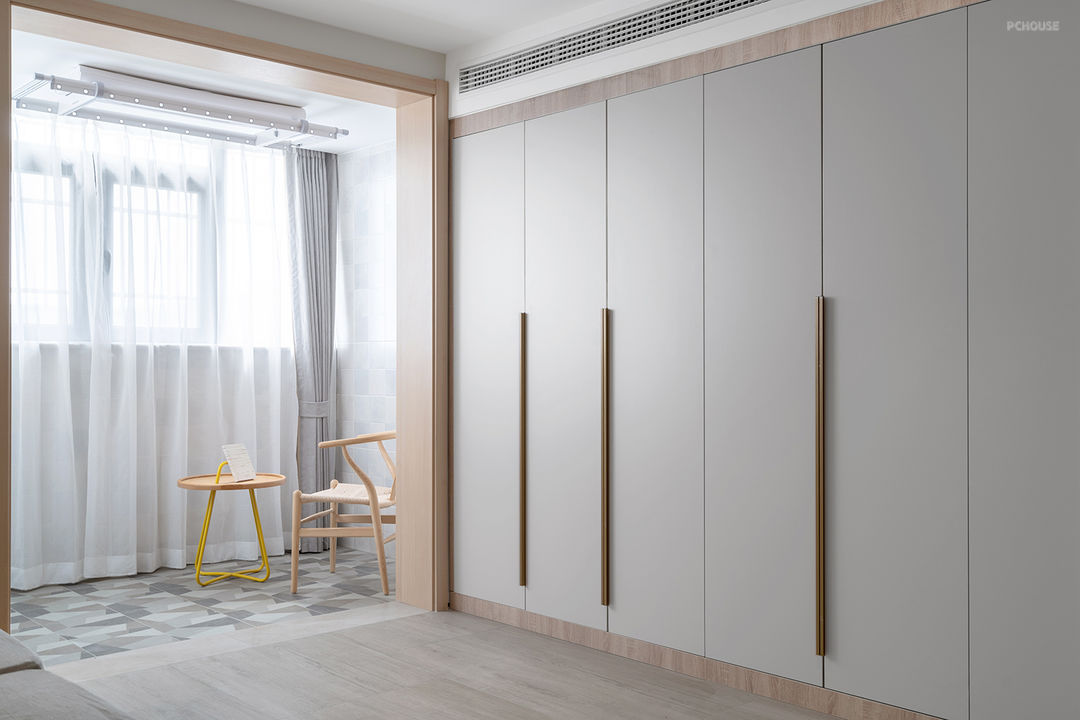 屋里的衣柜都是采用了灰色的门板,相比大众化的白色,灰色更耐脏一些而且灰色能体现出高级感,再搭配金色的长条把手,简直就是黄金搭档,这样的组合和别的家具好搭配所以也可以适用于很多空间。