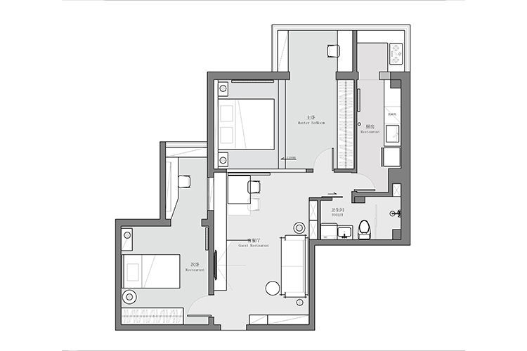 利用餐厅卡座的优势把原本比较混乱的公共区域进行了合理的划分,同时又保持一个整体性,进出主卧和厨卫动线也合理。