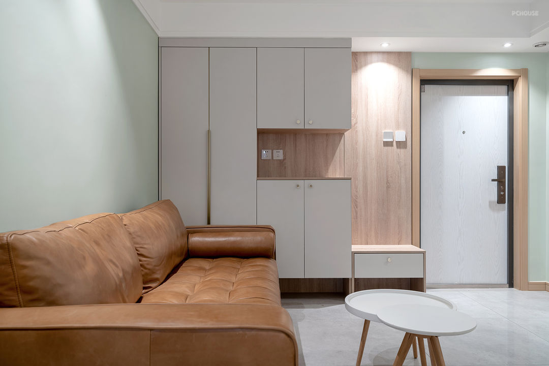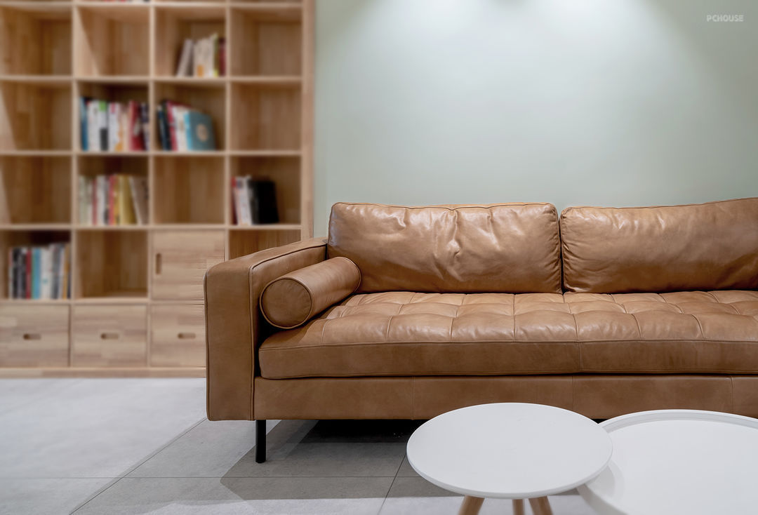 主沙发在材质上采用了皮质的,颜色的选择上用了相对比较亮的橘黄色。结合淡淡绿色的背景空间既温馨又安静。