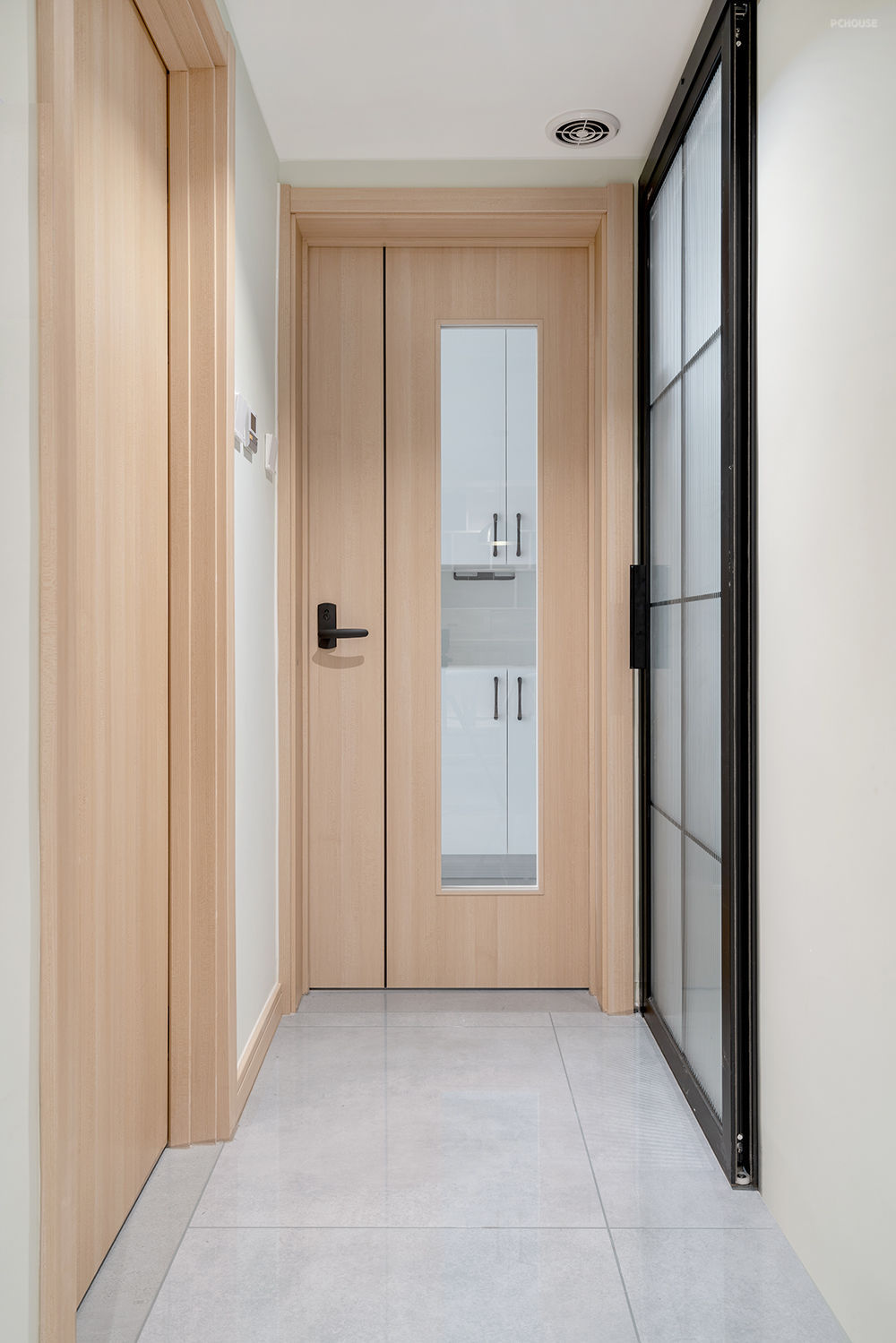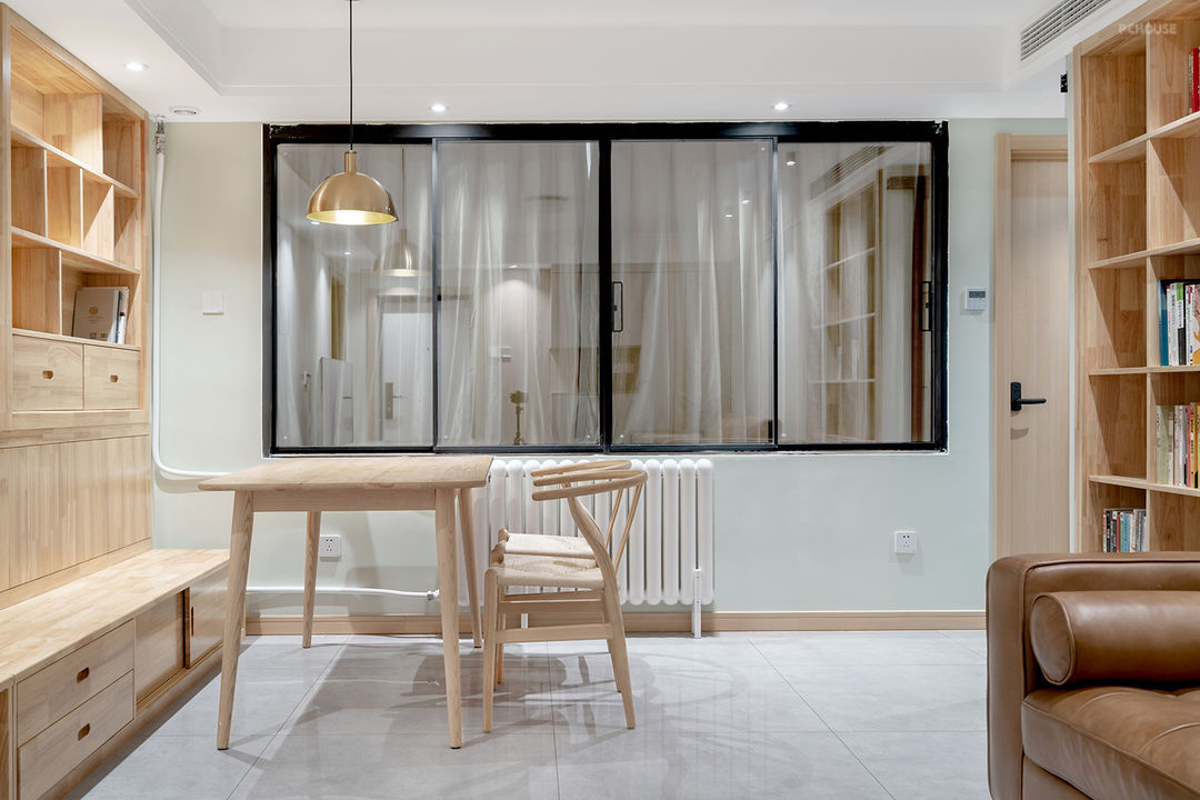 由于户型的原因,客餐厅是一个暗厅,通风相对也比较差,所以在设计上我们采用了玻璃窗的形式联通了客餐厅和主卧的空间,引进采光,窗子打开也可以通风,窗子内测加了窗帘,保证主卧的私密性。