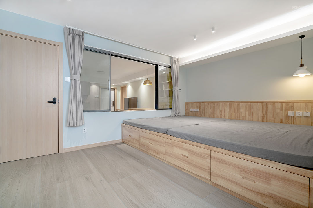 主卧的窗帘和窗子打开后空间感非常好,主卧的床采用了榻榻米的形式,这样大大的提升了屋里的收纳空间,一些换季的东西都可以有效的解决了。空间这样划分后主卧就有很大的空间给孩子作为玩耍的空间了。