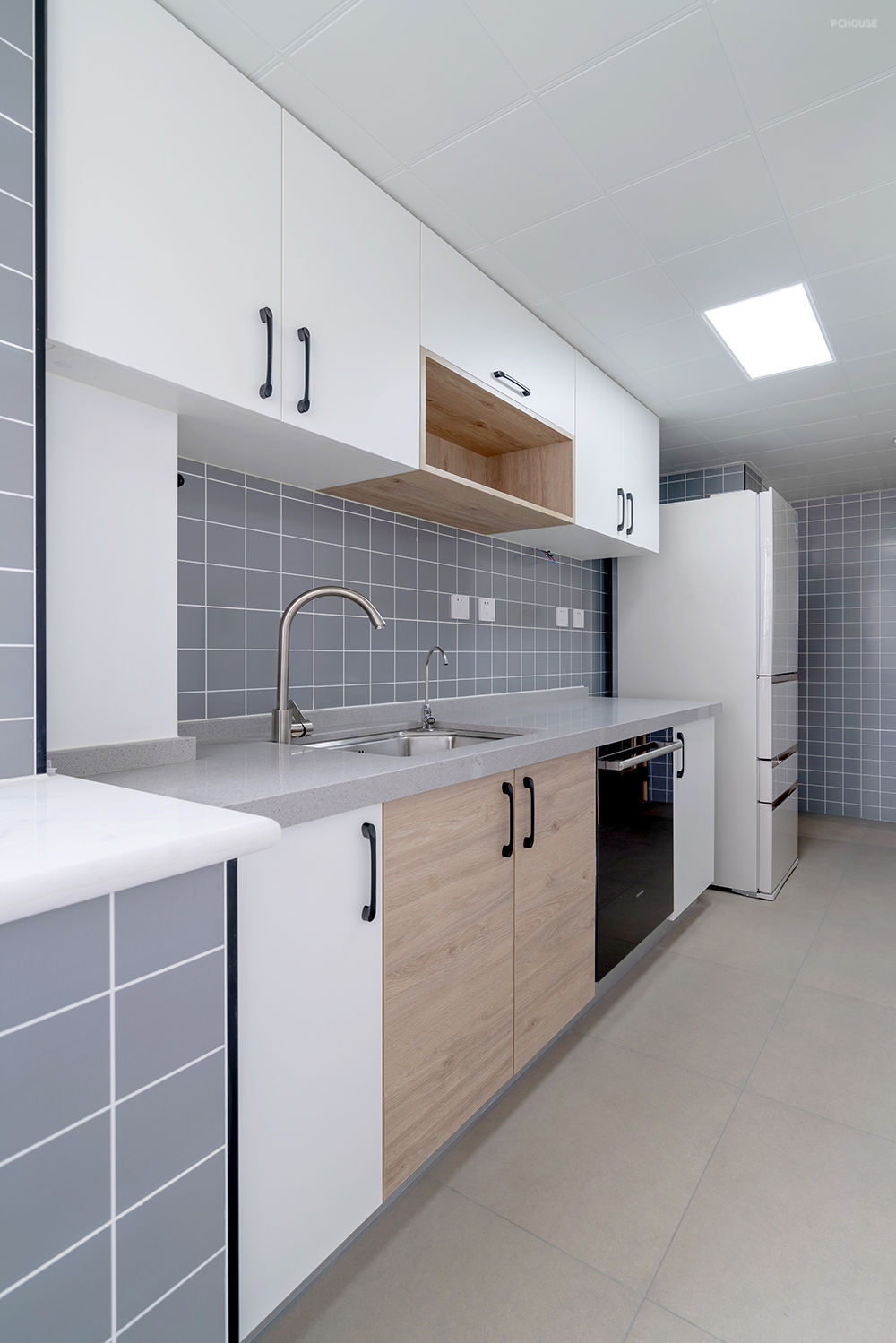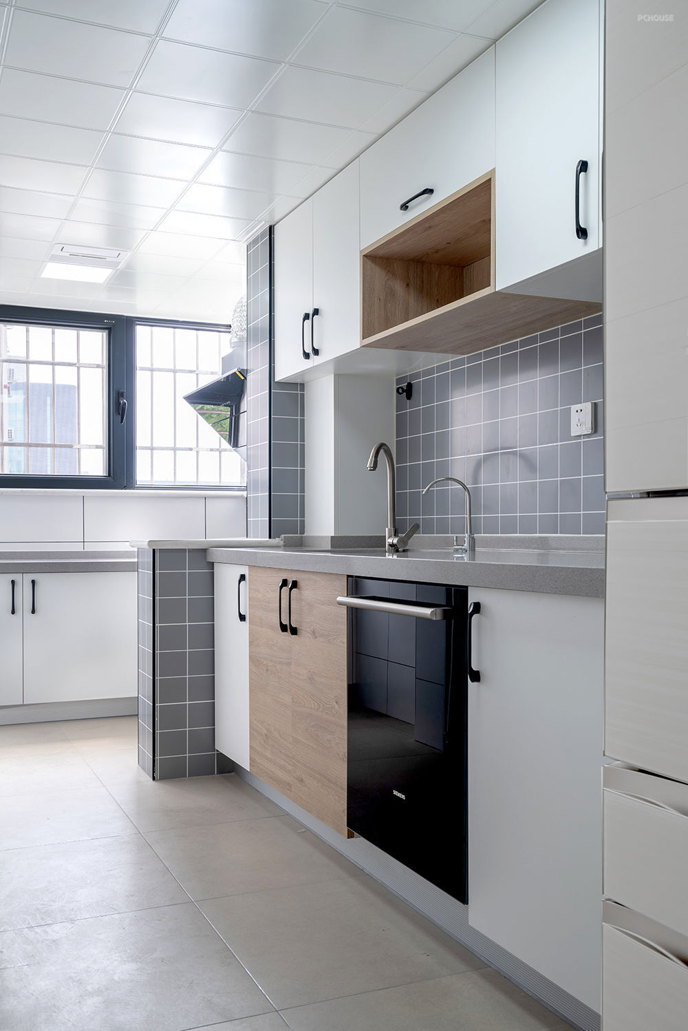 把阳台和厨房连同到一起后,空间的利用率有了实质性的提升,可以看到厨房的吊顶比较低,是因为这里面藏了新风内机,这个情况也是好多老小区都存在的问题,就是阳台的窗户是直接到顶的,没有窗户上沿,但是家里想安装新风,需要通到户外,这里就需要窗户厂家提前预留好洞口,然后把上面开洞的玻璃窗和下面平开窗之间的框体加宽,这样吊顶高度就以这个框体为准,这样一来管道就隐藏到吊顶里面,新风的安装也不受影响。