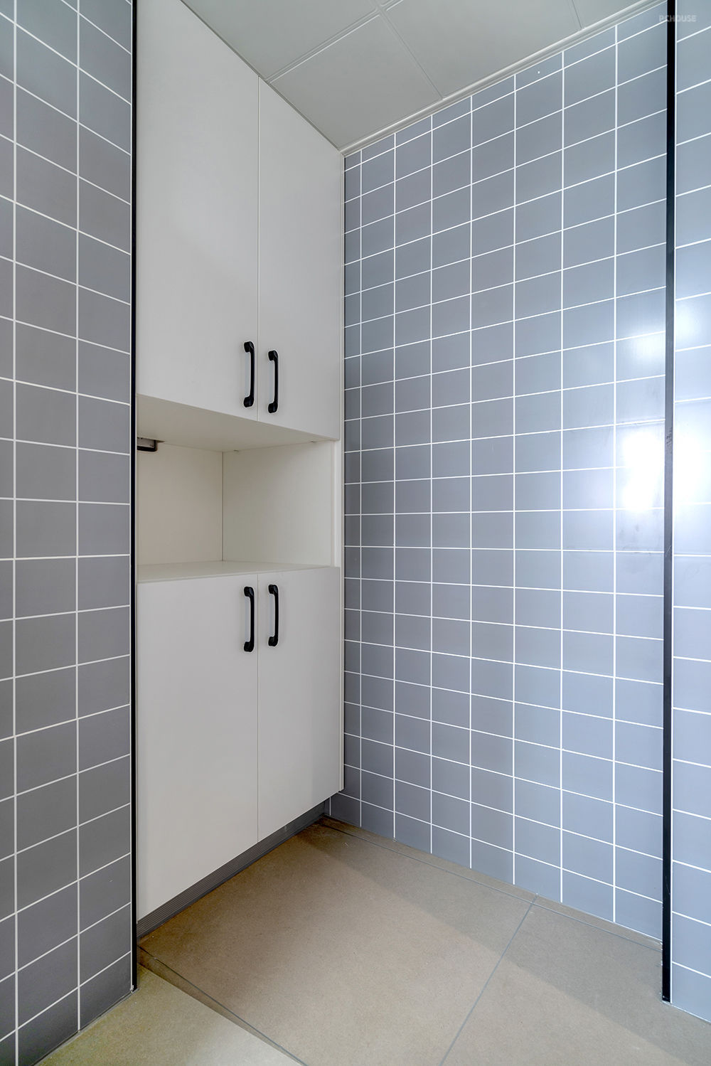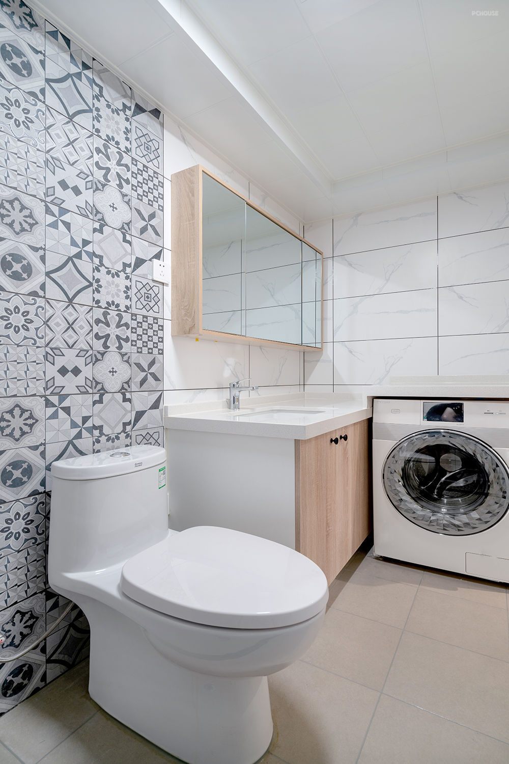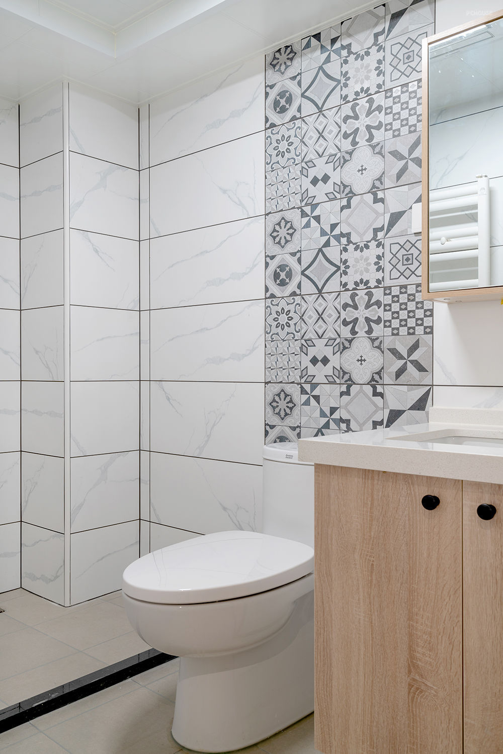 马桶后面贴了小花砖,做了一个背景,这样卫生间的墙面相当于有了一个跳色。淋浴房没有采用玻璃的形式,这个在后期加装一个浴帘就可以,这样浴帘收起来空间会显大,玻璃淋浴相对比较固定一些,这个空间不是很合适。