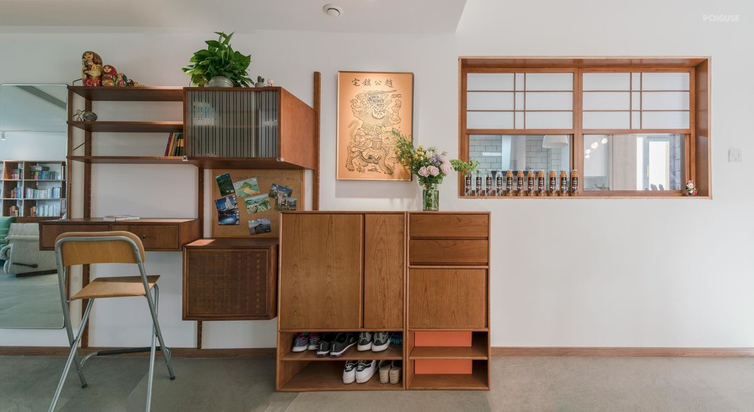 进门对面的组合柜,功能齐全,所有的柜体放在一起,有种日式小咖啡馆的味道