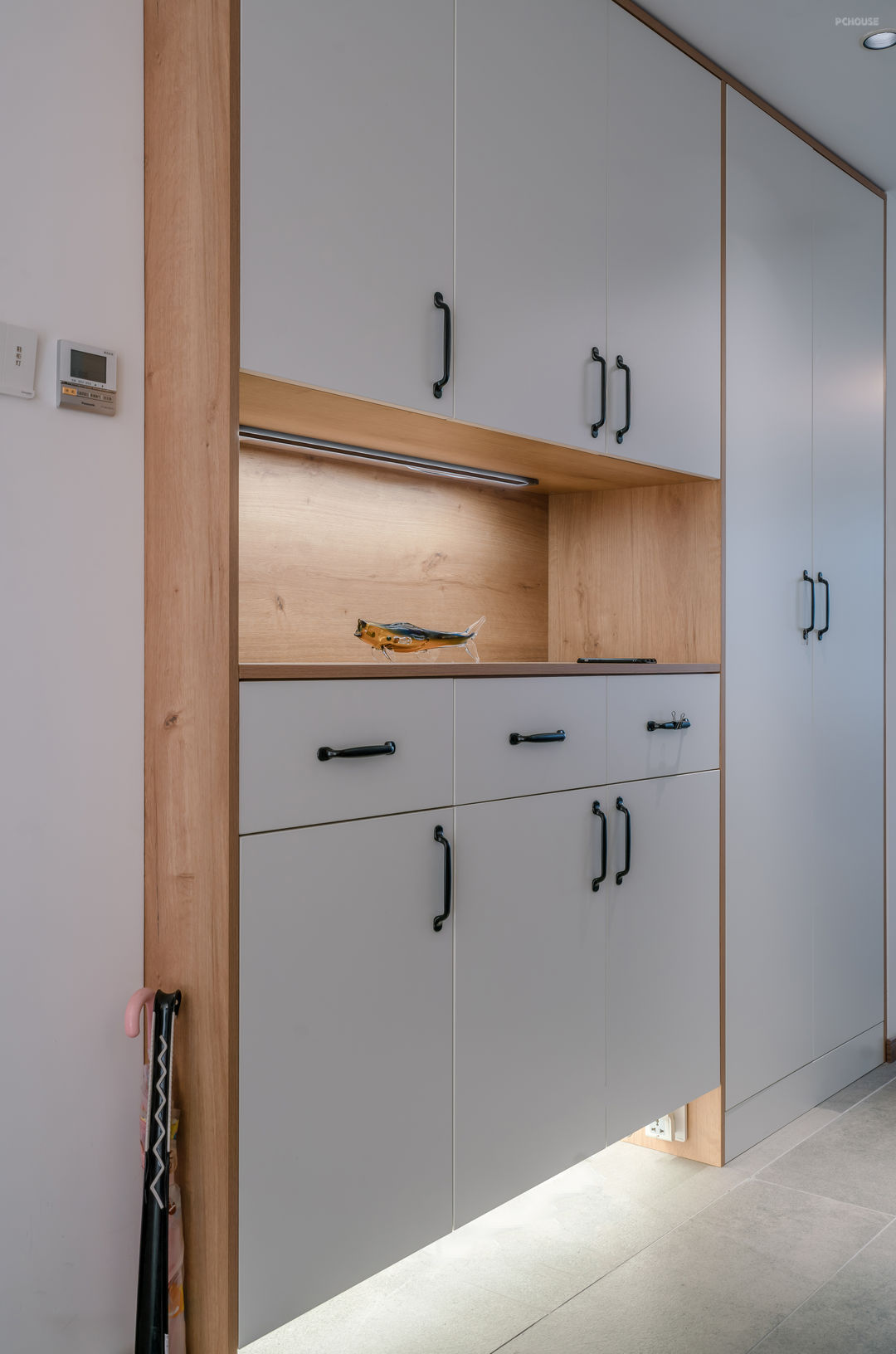 定制进门鞋帽柜,下面悬空打上灯光,可以放拖鞋,和扫地机器人。中间做空可以放包包。门板白色与侧板木纹色齐平,这样木线清晰明了有线条感