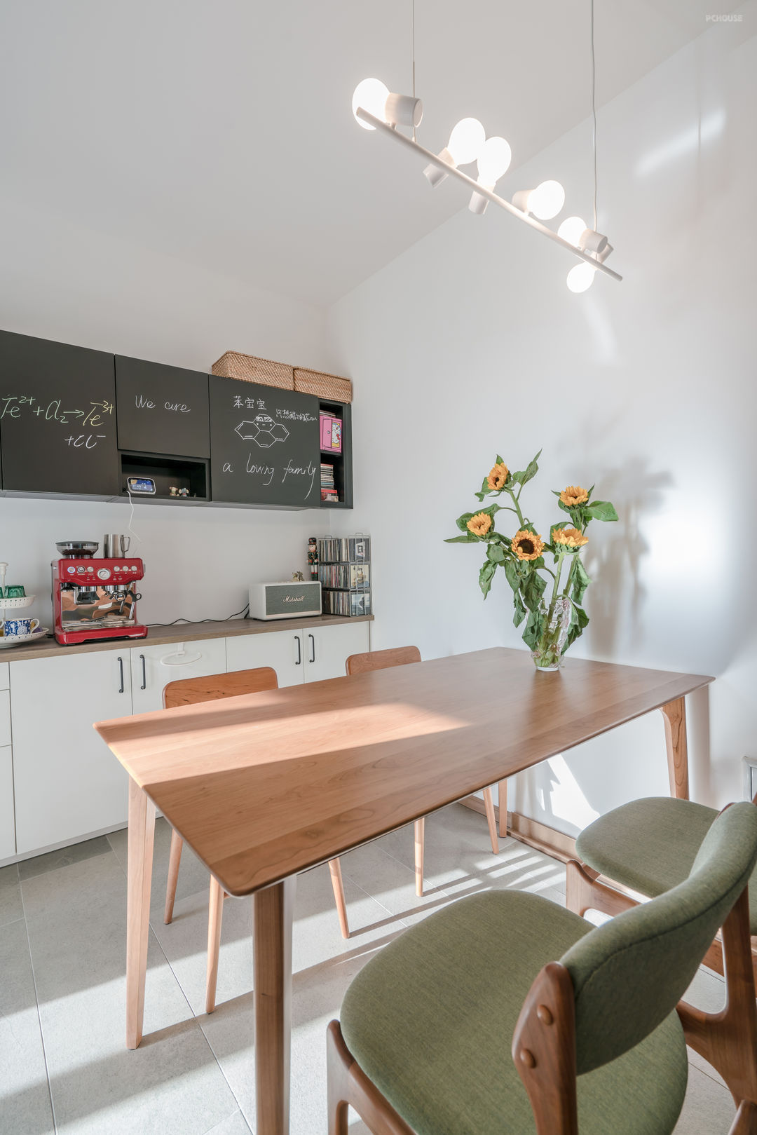 原来的厨房门洞扩大后改成了上下可以推拉的窗户,可以用来传菜。原来阳台的小窗户改成了进入厨房的门,午后的斜阳就会照射进来,特别是傍晚的时候,西侧阳光直射进入餐厅,煮杯咖啡,享受慢慢的阳光