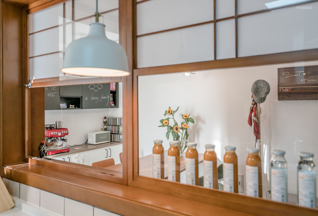 厨房的上下推拉的小橱窗,厨房位置和餐厅通过这个小橱窗衔接,有了它,日式复古咖啡馆搬到家里来啦!