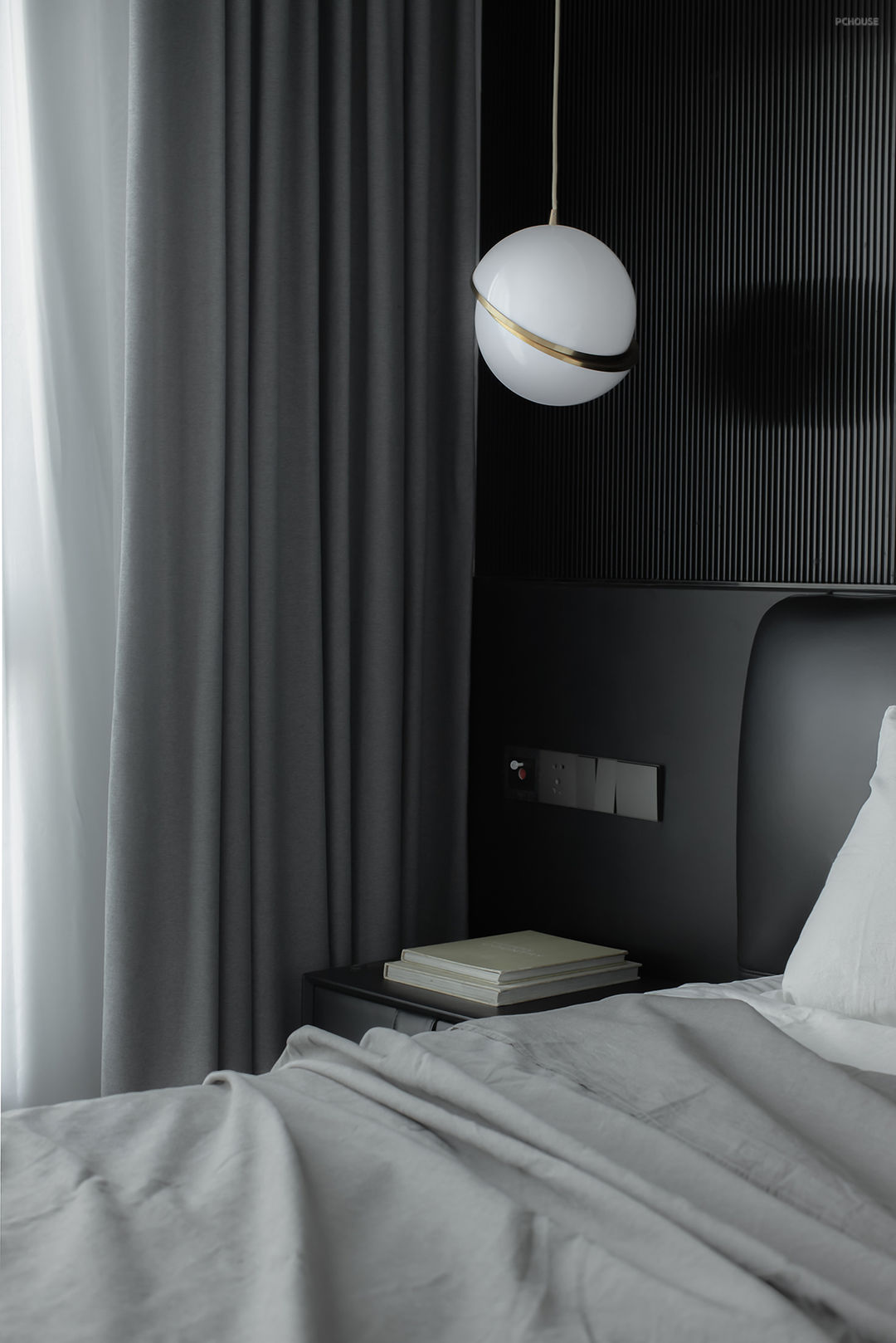 主卧室空间整体风格以现代为主,没有过多的处理手法。唯独床头做了黑色长虹玻璃的造型。底部氛围照明的设计,让“挑灯夜战”(经常熬夜)的你感到空间的安静即舒适感。