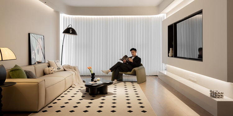 客厅,电视是临时用的旧电视,真正要用的电视还没到货,右边的落地灯是业主自己淘的,与整体设计很搭,地面木地板采用了45度斜铺的方式,相对普通正铺没那么死板