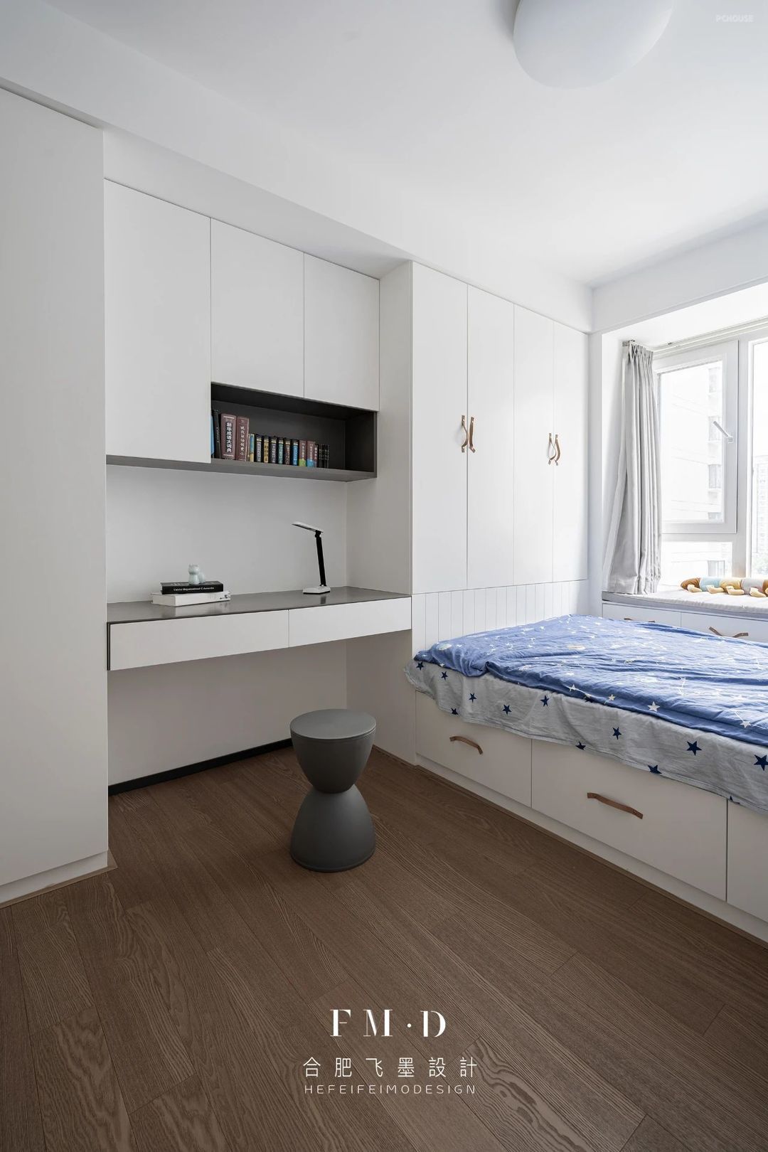 业主的孩子在上小学,阅读范围却很广;儿童房的面积局促,于是我们贴合空间设计了柜体收纳+榻榻米床,满足孩子学习、生活、储物的需求。