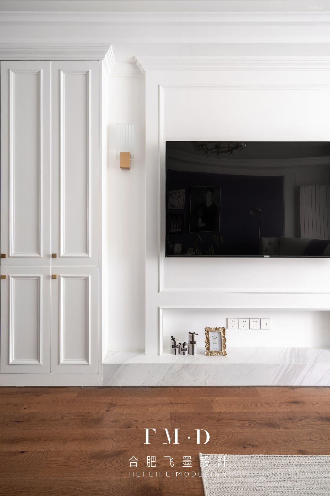 拆除原先土low且乏味的电视墙,利用护墙板做造型处理,两侧更是做了顶天的立柜进行收纳。