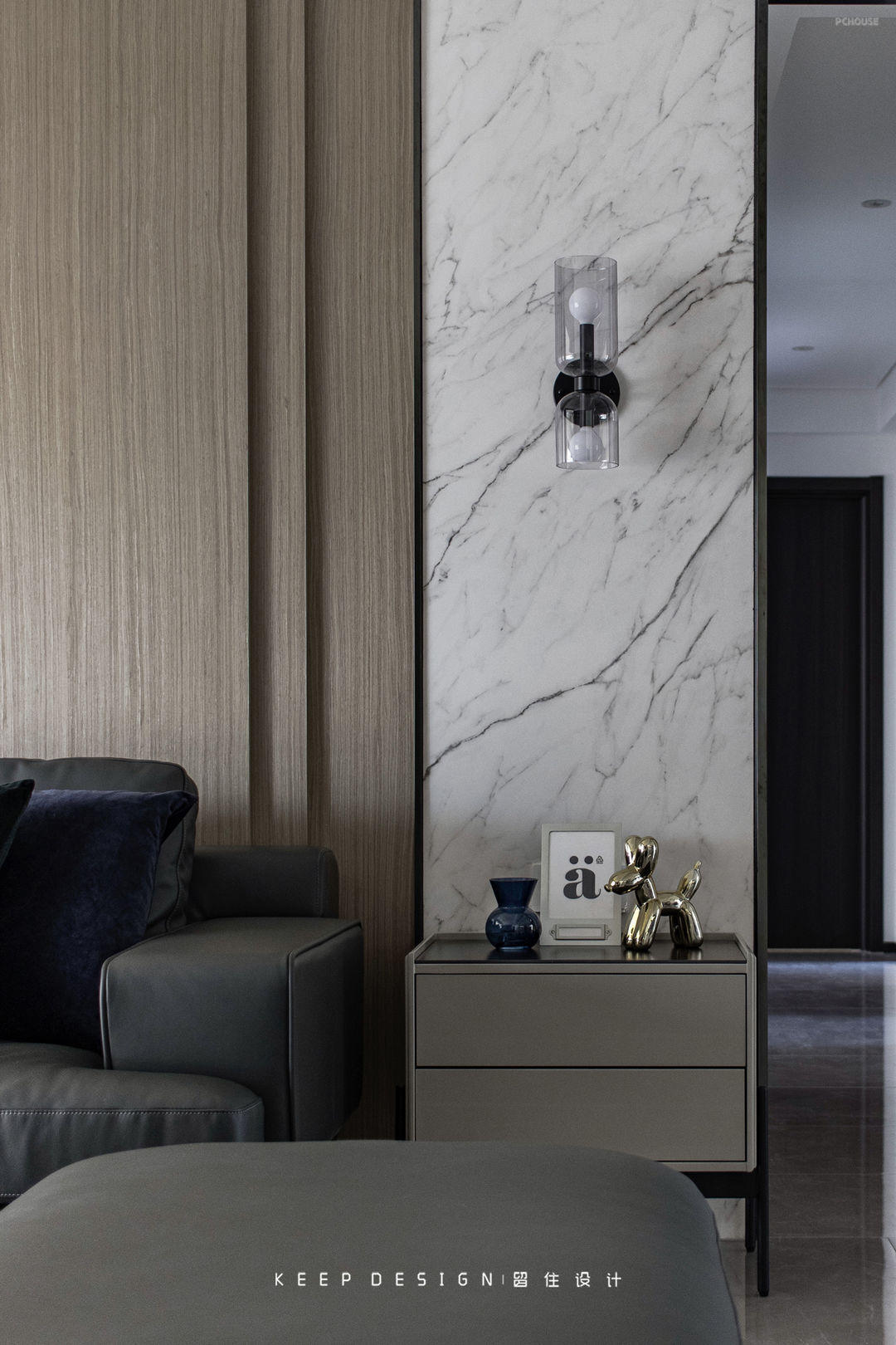 沙发墙主要用了木饰面做装饰。与此同时,在靠近走廊的位置增加了岩板。主要考虑到从玄关进来看到的角度是比较整体的,这样能与餐厅区域墙面一致,既有视觉延伸感,也丰富了墙面,不至于太单调。