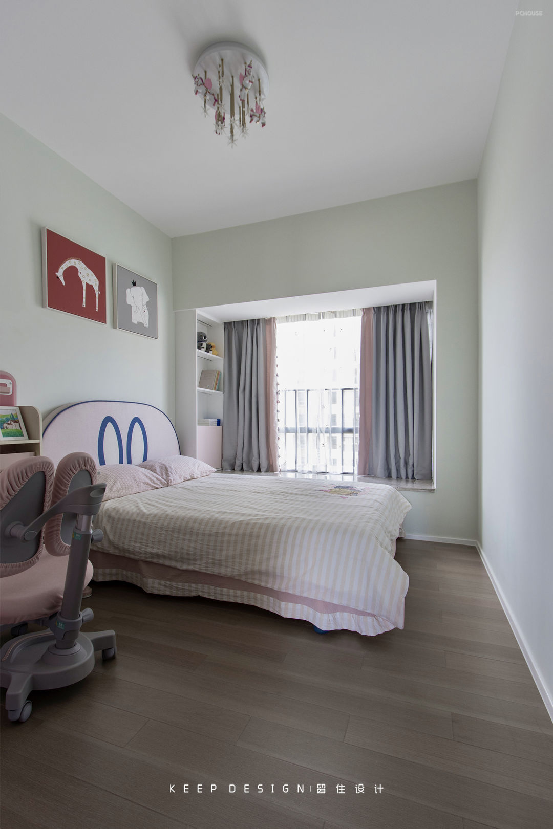 墙面特意选择清新的薄荷绿,平衡了女孩子们喜欢的粉红色,甜蜜中带着清爽,耐看、舒适。吸顶灯充满童趣和故事感,说不定小朋友抬头看到它时、可以激发她们的想象力~