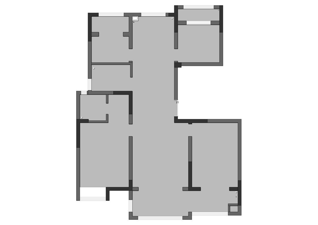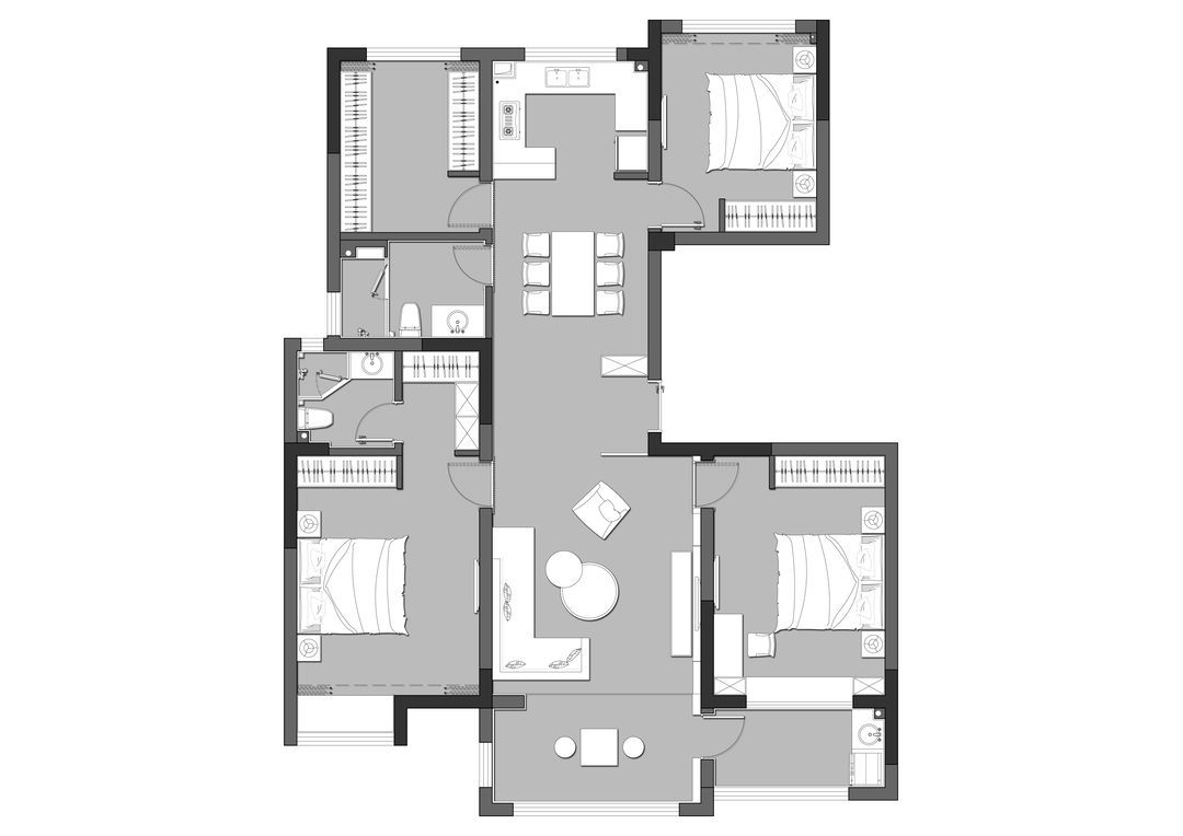 原始平面图 房屋为4室2厅结构,四个房间分别位于户型四角,客餐厅位于户型中央,整体房型呈蝴蝶状。所有房间的门都开向公共区域,一定程度降低了卧室的私密性,也使客餐厅的立面设计复杂化。业主希望保留三房的功能,将西北角的房间作为衣帽间,厨房设为开放式。少女心爆棚的女主人希望取消阳台与客厅之间的阻隔,突出阳台的生活感和仪式感,希望能在阳台区域实现喝茶聊天晒太阳养花的生活情趣。
