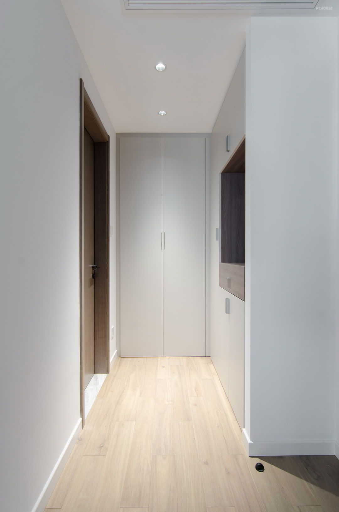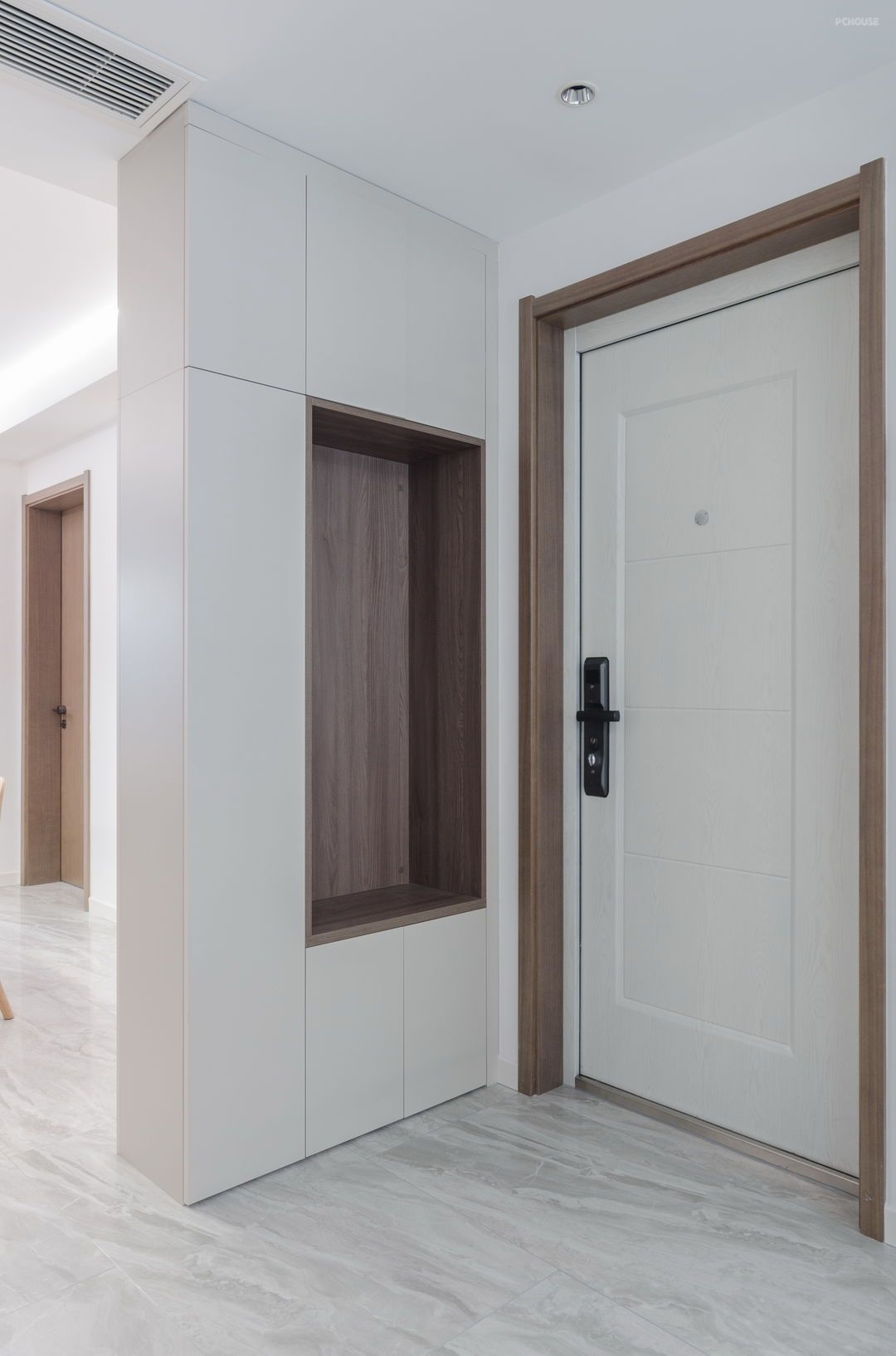 入户玄关第一视角。 玄关双侧既为了营造入口仪式感,也为了获取收纳功能, 在玄关北侧做了入户衣帽柜,南侧则对应玄关柜做了长虹玻璃的隔断, 使客厅不直接暴露于入户第一视角,在空间逻辑上形成缓冲。