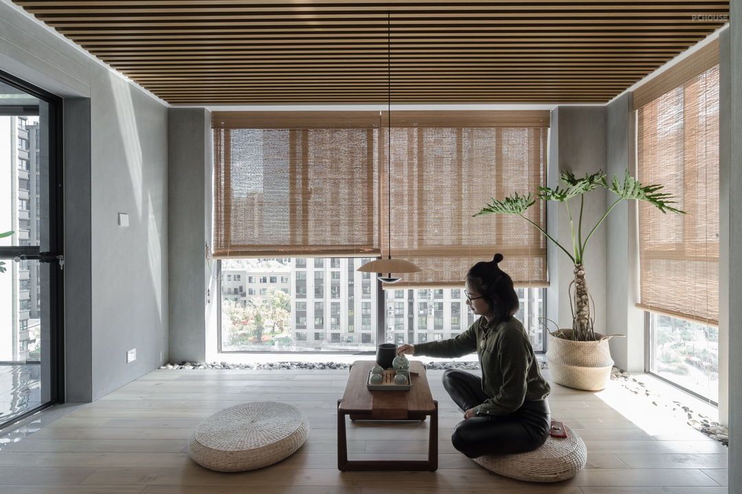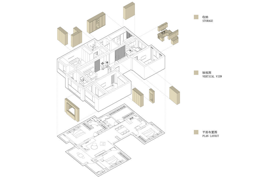 立足于业主的居住和审美需求,新的设计方案未对原房屋平面进行大的改动。设计侧重围绕空间细节尺度和界面处理展开: 1、玄关双侧既为了营造入口仪式感,也为了获取收纳功能,在玄关北侧做了入户衣帽柜,南侧则对应玄关柜做了长虹玻璃的隔断,使客厅不直接暴露于入户第一视角,在空间逻辑上形成缓冲。 2、将两个北次卧的非承重墙体拆除,西侧次卧作为衣帽间,东侧作为备用的客房。 3、将阳台做了区隔,东侧作为晾晒区,与客厅对应的部分则作为客厅功能的延伸,整体做了抬高,墙面采用水泥板,天花采用条形木格栅在材质上与客厅的功能性做出区分,氛围上更强调随性。 4、厨房做了开放式,台面延伸处设置了小吧台,也是女主人的心头好。