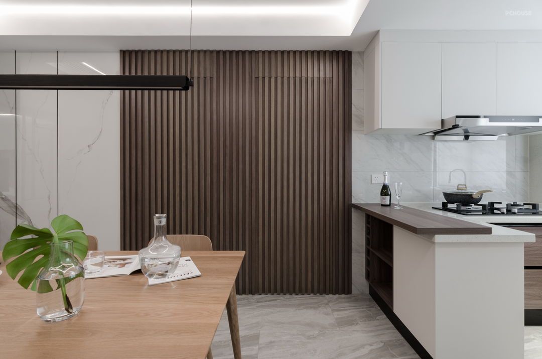 考虑到公共区墙面过长,且房门较多的情况, 我们将客厅西侧墙面的三扇门与东侧南次卧的房门均做了格栅暗门处理。 恰好业主喜爱白色石材, 于是白色石材纹的大板砖顺理成章的成为了玄关一景。
