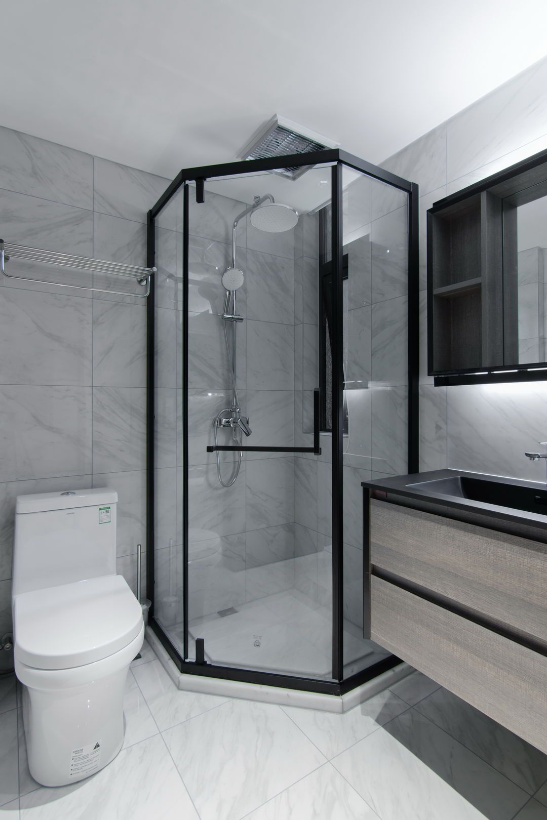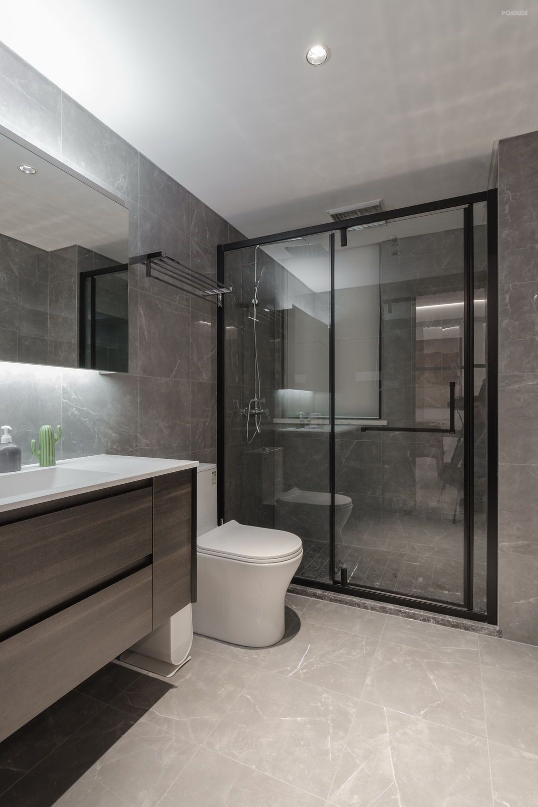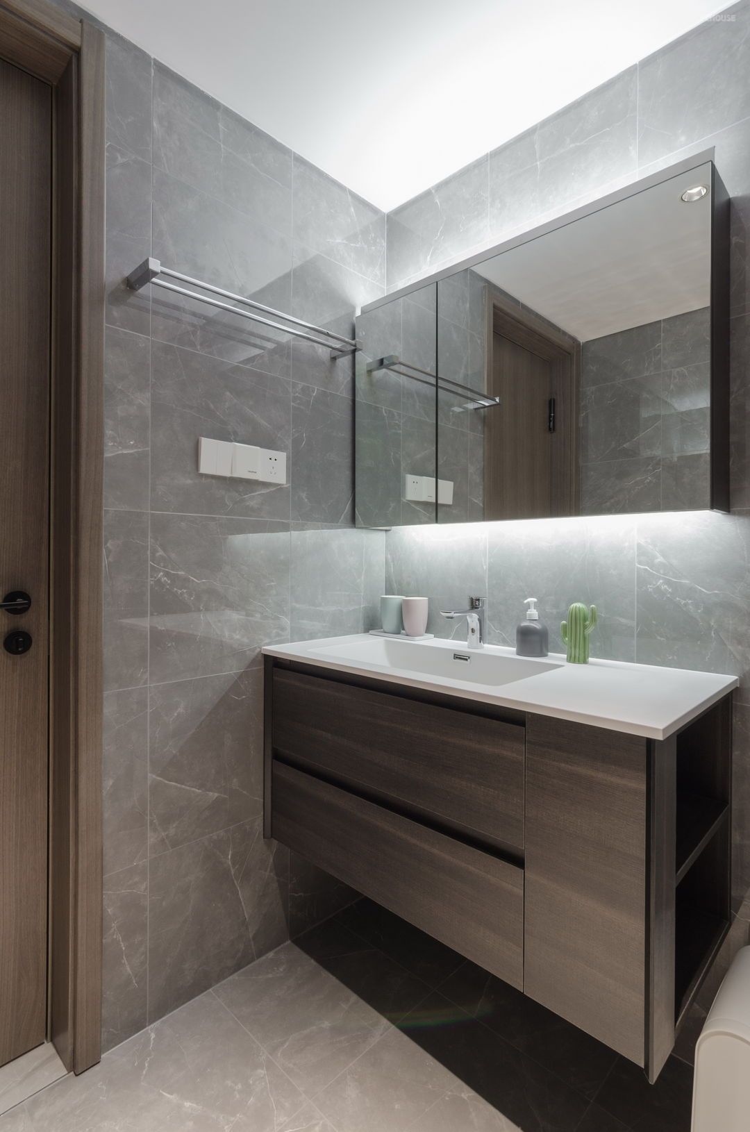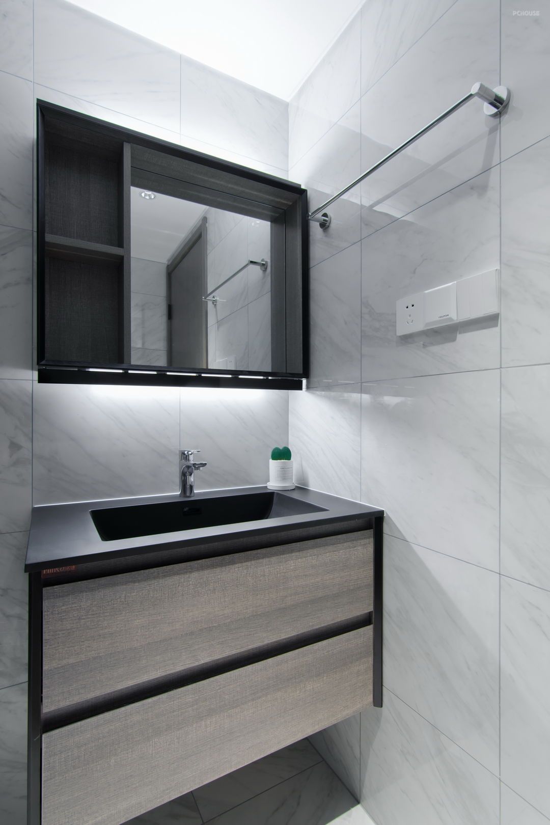 业主喜爱白色石材, 于是白色石材纹的大板砖顺理成章的成为了玄关一景, 立面上做了不规则留缝后嵌入黑色铝合金线细条,质感立显。