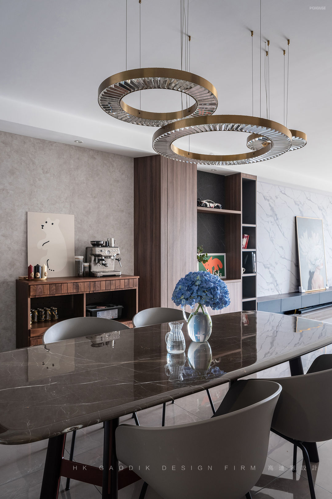 金属吊灯是餐厅区域的亮点,有别于客厅的舒适开放,餐厅更注重聚合的氛围。