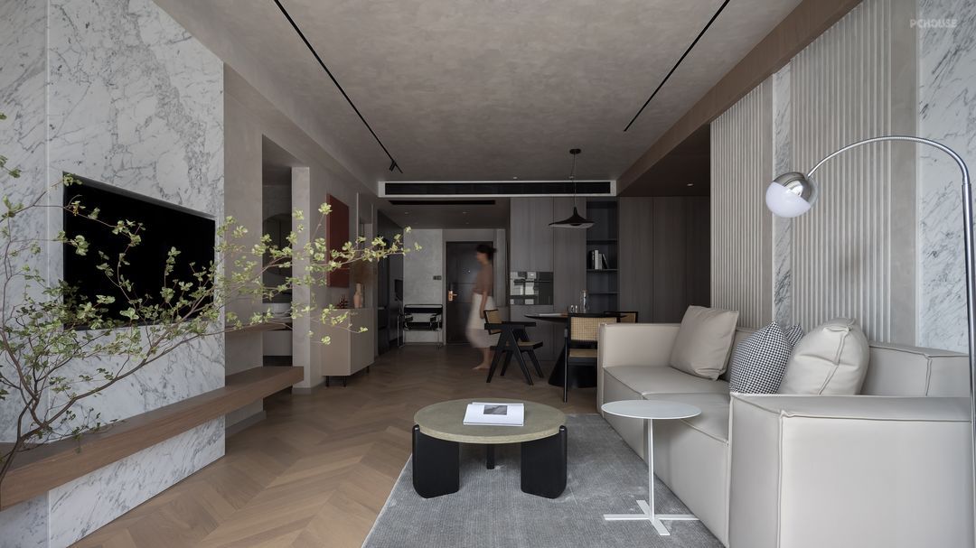 客厅不算大,但足够整洁纯净。木质的层板,温润的石材,顶面采用艺术漆材质处理,搭配舒适柔软的皮质沙发,木质的鱼骨地板,让空间格外的舒适,没有任何的压抑,给人非常放松的感觉。