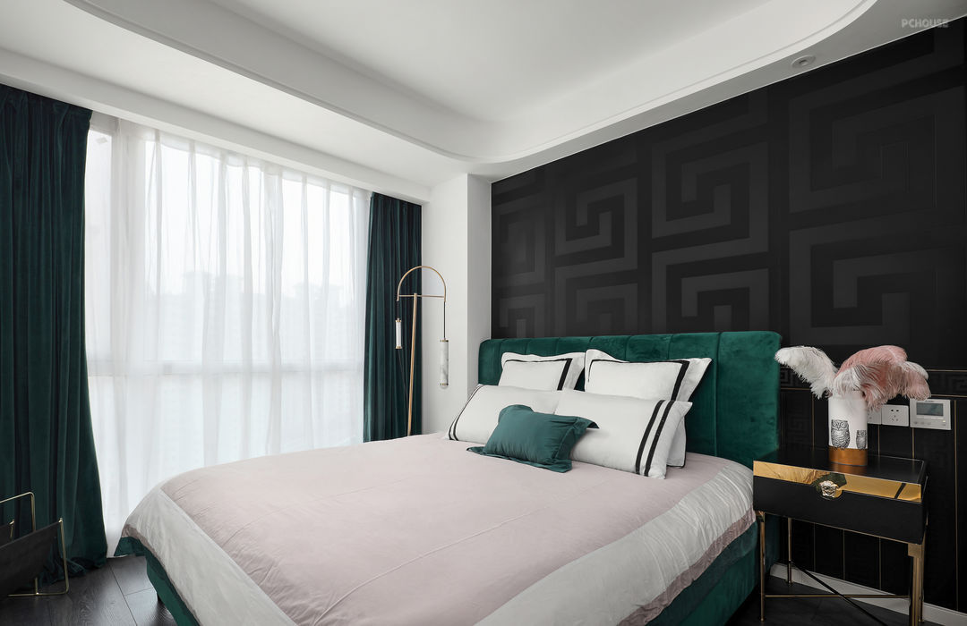 设计师将主卧室设计成为带有衣帽间和内卫的套间,利用衣帽间做了一个隔断,避免直面卫生间的同时,也为主卧室营造了一个享受的私密氛围。 温和柔软的绿绒布面料构成卧室雅致格调,与光影氛围相互掩映,渲染出休憩时光的温情相伴