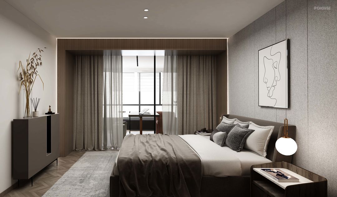 在卧室中属性材料的运用也与公共空间相呼应,而在材料上优先采用简洁、环保与安全设计方案与装修材料,选择天然与有机面料的家纺用品。