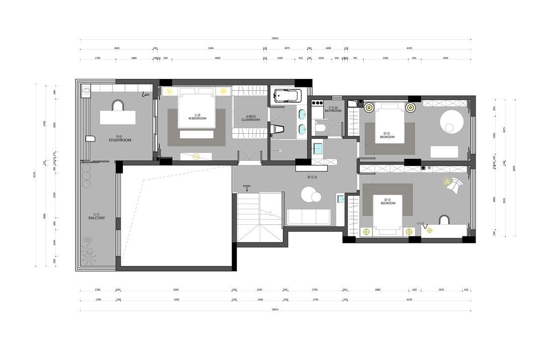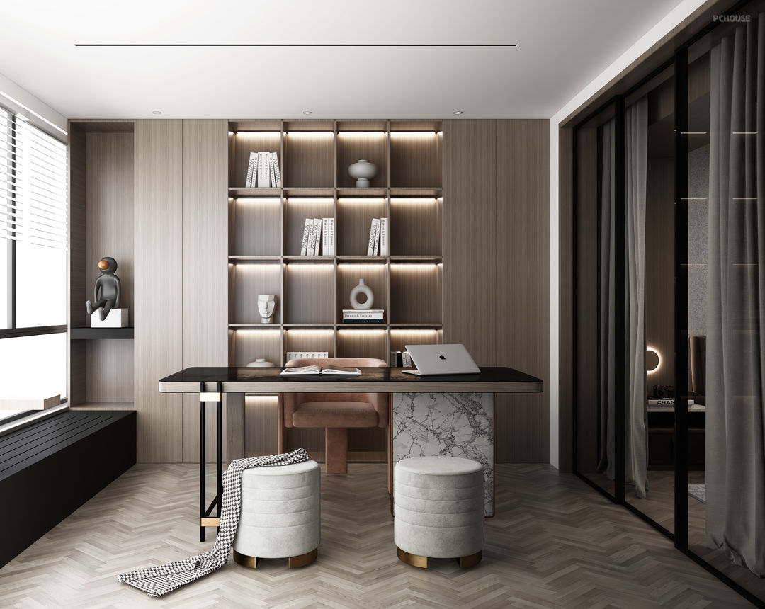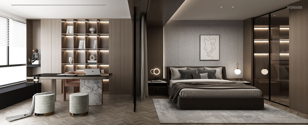 主卧的设计中,将主卧、衣帽间、主卫及书房呈一条线设计,在动线上更为便利,每个空间隔而不断,给不同的使用人员相互交流,又互不影响。